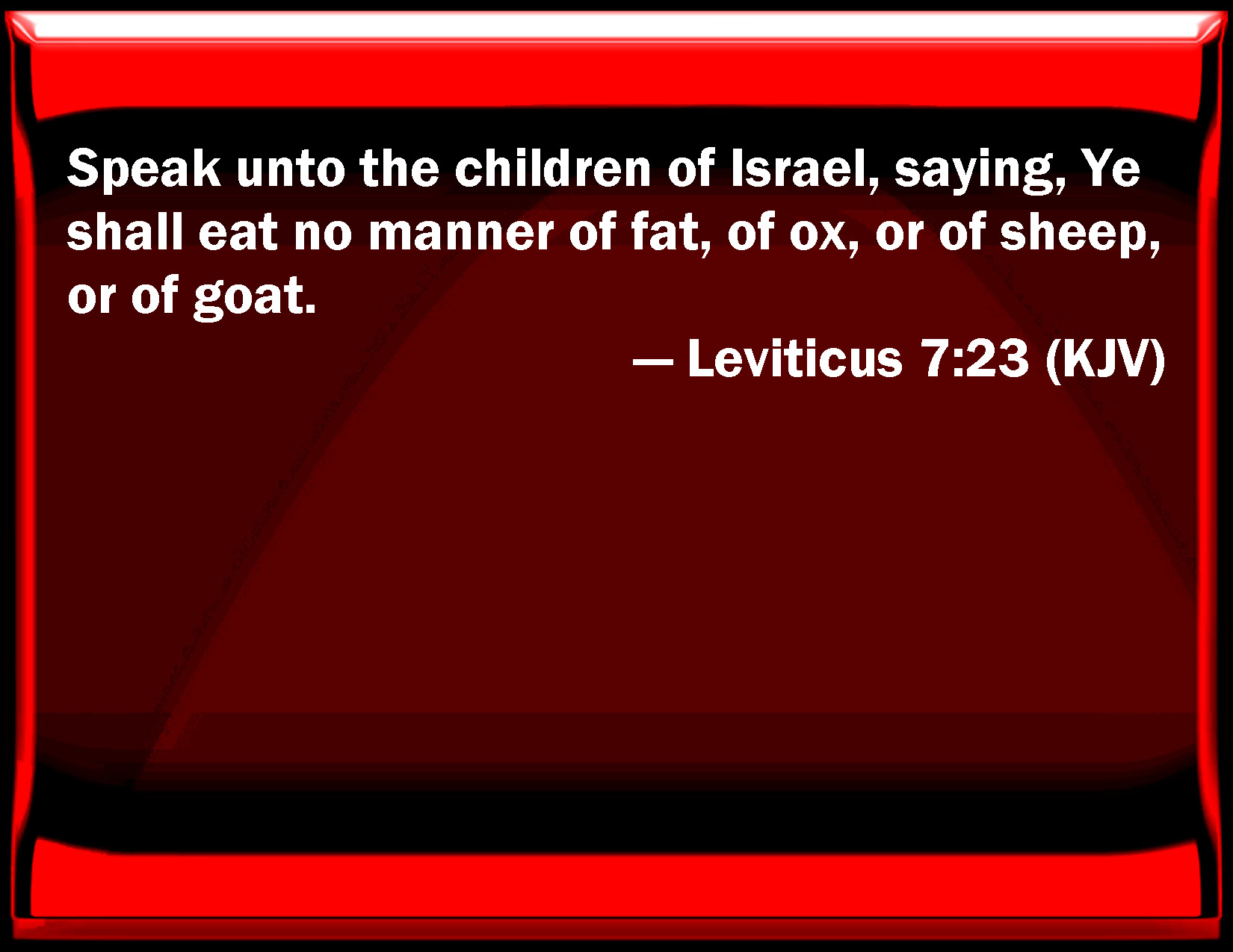 Bible Verse Slide Leviticus 7:23 Speak to the children of Israel, saying, You shall eat no manner of fat, of ox, or of sheep, or of goat. KJV: Speak unto the children of Israel, saying, Ye shall eat no manner of fat, of ox, or of sheep, or of goat. DRB: Say to the children of Israel: The fat of a sheep, and of an ox, and of a goat you shall not eat. DBT: Speak unto the children of Israel, saying, No fat, of ox, or of sheep, or of goat shall ye eat. ERV: Speak unto the children of Israel, saying, Ye shall eat no fat, of ox, or sheep, or goat. WBT: Speak to the children of Israel, saying, Ye shall eat no manner of fat, of ox, or of sheep, or of goat. WEB: "Speak to the children of Israel, saying, 'You shall eat no fat, of bull, or sheep, or goat. YLT: 'Speak unto the sons of Israel, saying, Any fat of ox and sheep and goat ye do not eat;Links Leviticus 7:23 NIV • Leviticus 7:23 NLT • Leviticus 7:23 ESV • Leviticus 7:23 NASB • Leviticus 7:23 KJV • Leviticus 7:23 Interlinear • Leviticus 7:23 Commentaries • Leviticus 7:23 Parallel Texts • Leviticus 7:23 Bible Apps • Leviticus 7:23 Parallel • Bible Hub |