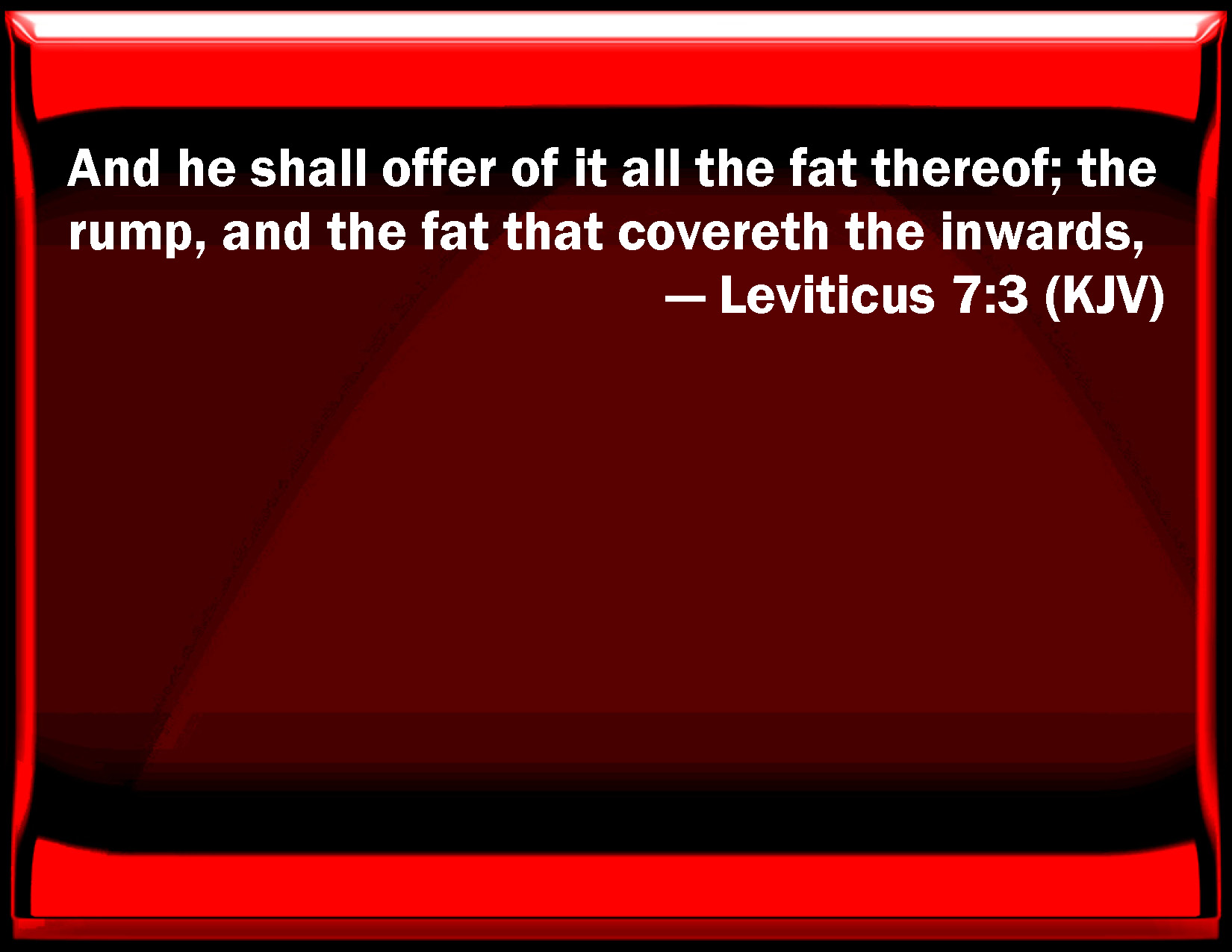 Bible Verse Slide Leviticus 7:3 And he shall offer of it all the fat thereof; the rump, and the fat that covers the inwards, KJV: And he shall offer of it all the fat thereof; the rump, and the fat that covereth the inwards, DRB: They shall offer thereof the rump and the fat that covereth the entrails: DBT: And he shall present of it all the fat thereof; the fat tail and the fat that covereth the inwards, ERV: And he shall offer of it all the fat thereof; the fat tail, and the fat that covereth the inwards, WBT: And he shall offer of it all its fat; the rump, and the fat that covereth the inwards, WEB: He shall offer all of its fat: the fat tail, and the fat that covers the innards, YLT: and all its fat he bringeth near out of it, the fat tail, and the fat which is covering the inwards,Links Leviticus 7:3 NIV • Leviticus 7:3 NLT • Leviticus 7:3 ESV • Leviticus 7:3 NASB • Leviticus 7:3 KJV • Leviticus 7:3 Interlinear • Leviticus 7:3 Commentaries • Leviticus 7:3 Parallel Texts • Leviticus 7:3 Bible Apps • Leviticus 7:3 Parallel • Bible Hub |