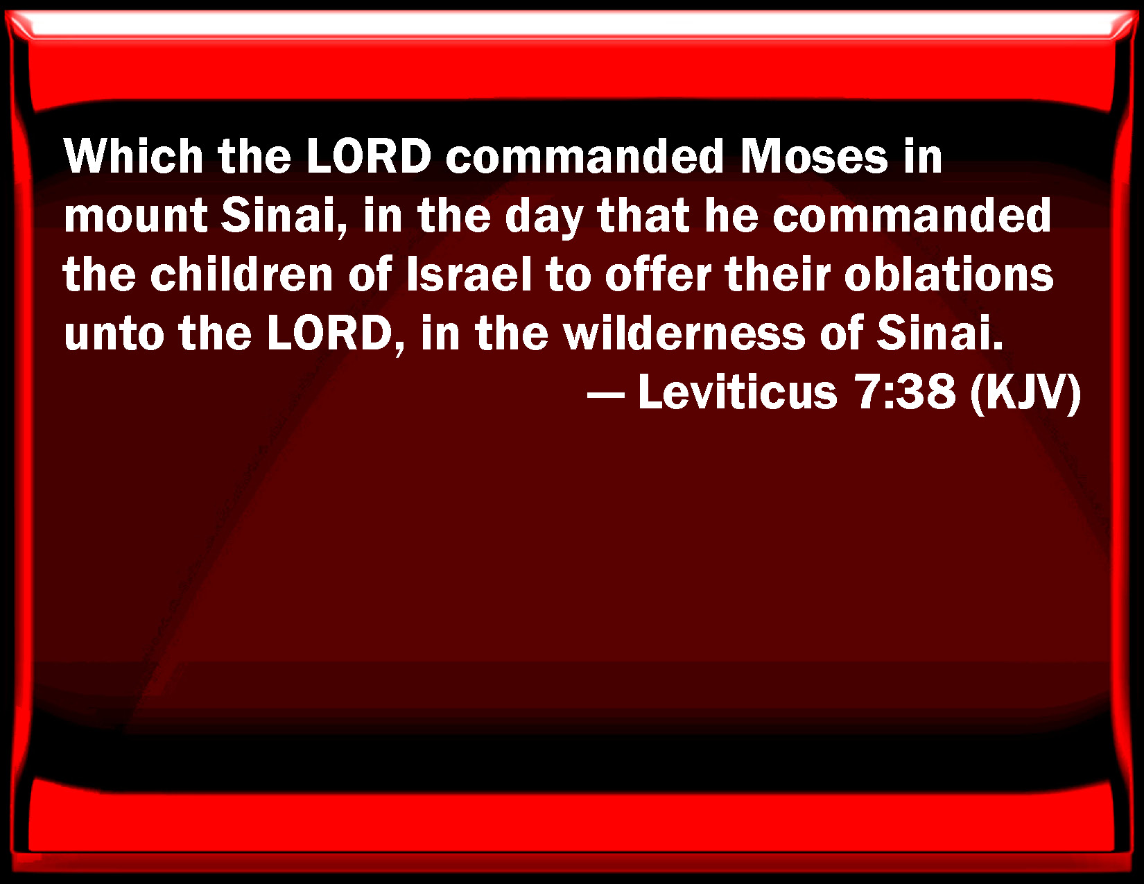 Bible Verse Slide Leviticus 7:38 Which the LORD commanded Moses in mount Sinai, in the day that he commanded the children of Israel to offer their oblations to the LORD, in the wilderness of Sinai. KJV: Which the LORD commanded Moses in mount Sinai, in the day that he commanded the children of Israel to offer their oblations unto the LORD, in the wilderness of Sinai. DRB: Which the Lord appointed to Moses in mount Sinai, when he commanded the children of Israel, that they should offer their oblations to the Lord in the desert of Sinai. DBT: which Jehovah commanded Moses in mount Sinai, in the day that he commanded the children of Israel to present their offerings to Jehovah, in the wilderness of Sinai. ERV: which the LORD commanded Moses in mount Sinai, in the day that he commanded the children of Israel to offer their oblations unto the LORD, in the wilderness of Sinai. WBT: Which the LORD commanded Moses in mount Sinai, in the day that he commanded the children of Israel to offer their oblations to the LORD, in the wilderness of Sinai. WEB: which Yahweh commanded Moses in Mount Sinai, in the day that he commanded the children of Israel to offer their offerings to Yahweh, in the wilderness of Sinai. YLT: which Jehovah hath commanded Moses in Mount Sinai, in the day of his commanding the sons of Israel to bring near their offerings to Jehovah, in the wilderness of Sinai.Links Leviticus 7:38 NIV • Leviticus 7:38 NLT • Leviticus 7:38 ESV • Leviticus 7:38 NASB • Leviticus 7:38 KJV • Leviticus 7:38 Interlinear • Leviticus 7:38 Commentaries • Leviticus 7:38 Parallel Texts • Leviticus 7:38 Bible Apps • Leviticus 7:38 Parallel • Bible Hub |