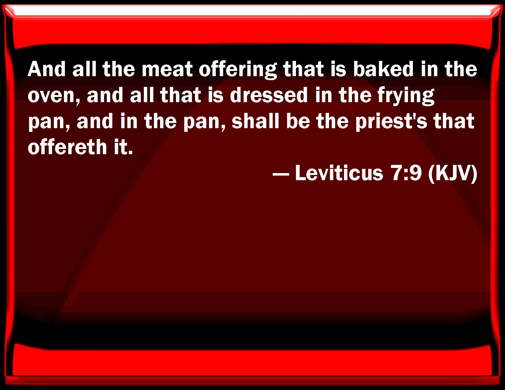 Bible Verse Slide Leviticus 7:9 And all the meat offering that is baked in the oven, and all that is dressed in the frying pan, and in the pan, shall be the priest's that offers it. KJV: And all the meat offering that is baken in the oven, and all that is dressed in the fryingpan, and in the pan, shall be the priest's that offereth it. DRB: And every sacrifice of flour that is baked in the oven, and whatsoever is dressed on the gridiron, or in the fryingpan, shall be the priest's that offereth it: DBT: And every oblation that is baken in the oven, and all that is prepared in the cauldron and in the pan, shall be the priest's who offereth it; to him it shall belong. ERV: And every meal offering that is baken in the oven, and all that is dressed in the frying pan, and on the baking pan, shall be the priest's that offereth it. WBT: And all the meat-offering that is baked in the oven, and all that is dressed in the frying-pan, and in the pan, shall be the priest's that offereth it. WEB: Every meal offering that is baked in the oven, and all that is dressed in the pan, and on the griddle, shall be the priest's who offers it. YLT: and every present which is baked in an oven, and every one done in a frying-pan, and on a girdel, is the priest's who is bringing it near; it is his;Links Leviticus 7:9 NIV • Leviticus 7:9 NLT • Leviticus 7:9 ESV • Leviticus 7:9 NASB • Leviticus 7:9 KJV • Leviticus 7:9 Interlinear • Leviticus 7:9 Commentaries • Leviticus 7:9 Parallel Texts • Leviticus 7:9 Bible Apps • Leviticus 7:9 Parallel • Bible Hub |
