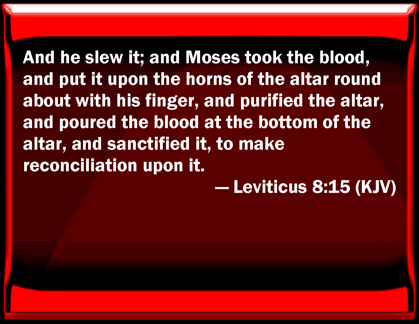 KJV:  And he slew it; and Moses took the blood, and put it upon the horns of the altar round about with his finger, and purified the altar, and poured the blood at the bottom of the altar, and sanctified it, to make reconciliation upon it.