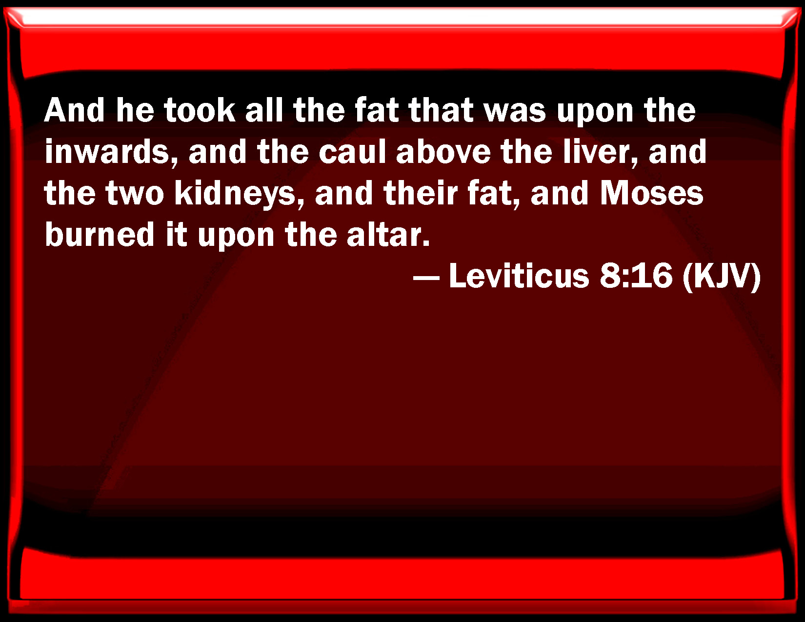 DBT:  And he took all the fat that was on the inwards, and the net of the liver, and the two kidneys, and their fat, and Moses burned them on the altar.