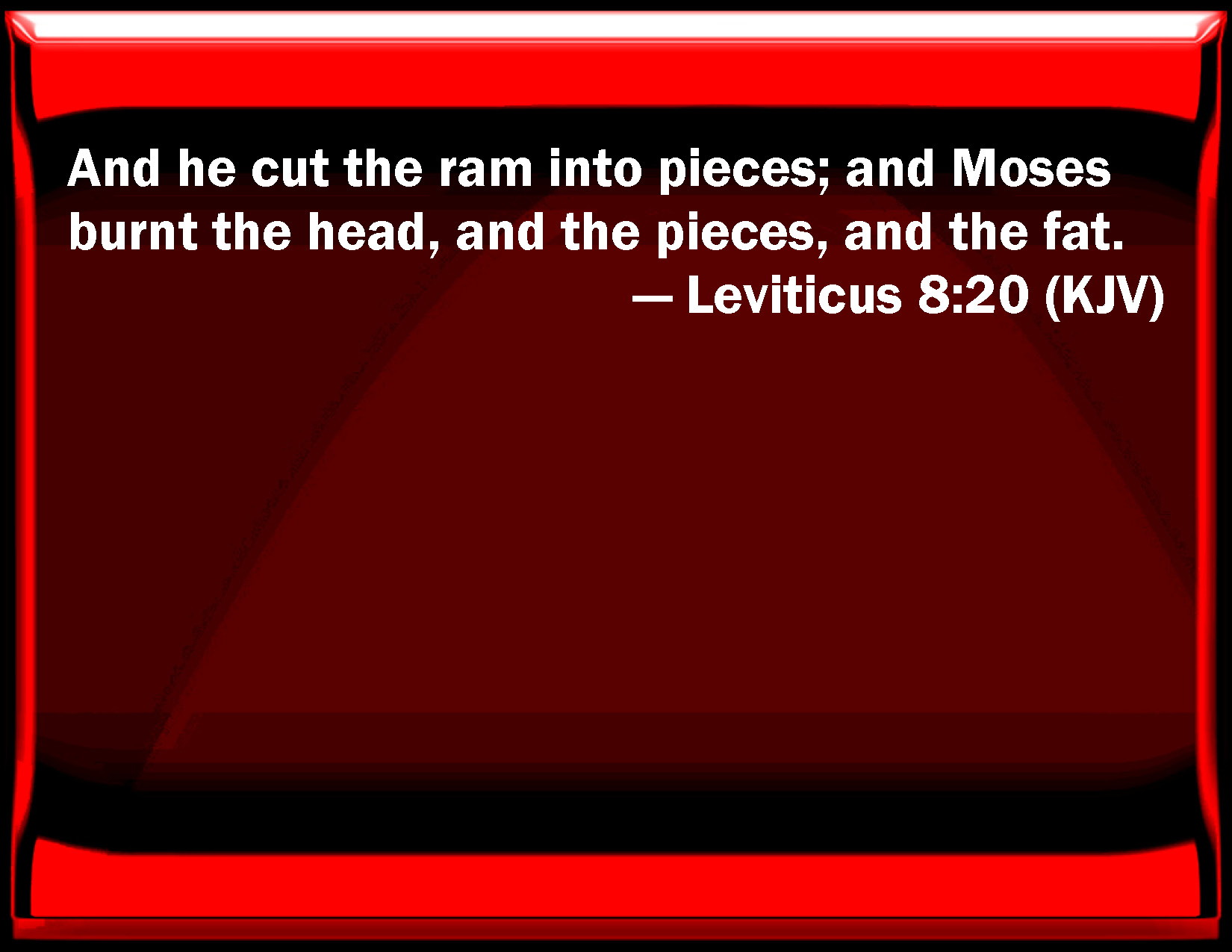Bible Verse Slide Leviticus 8:20 And he cut the ram into pieces; and Moses burnt the head, and the pieces, and the fat. KJV: And he cut the ram into pieces; and Moses burnt the head, and the pieces, and the fat. DRB: And cutting the ram into pieces, the head thereof, and the joints, and the fat he burnt in the fire, DBT: And the ram he cut up into its pieces; and Moses burned the head, and the pieces, and the fat; ERV: And he cut the ram into its pieces; and Moses burnt the head, and the pieces, and the fat. WBT: And he cut the ram into pieces; and Moses burnt the head, and the pieces, and the fat. WEB: He cut the ram into its pieces; and Moses burned the head, and the pieces, and the fat. YLT: and the ram he hath cut into its pieces, and Moses maketh perfume with the head, and the pieces, and the fat,Links Leviticus 8:20 NIV • Leviticus 8:20 NLT • Leviticus 8:20 ESV • Leviticus 8:20 NASB • Leviticus 8:20 KJV • Leviticus 8:20 Interlinear • Leviticus 8:20 Commentaries • Leviticus 8:20 Parallel Texts • Leviticus 8:20 Bible Apps • Leviticus 8:20 Parallel • Bible Hub |