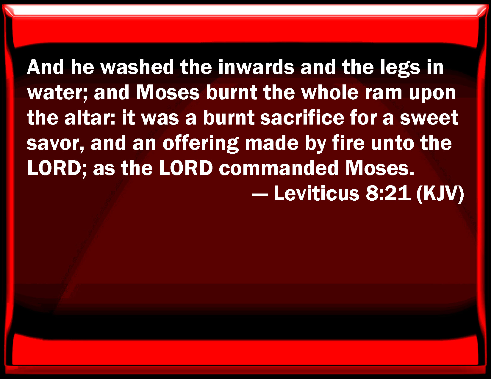 Bible Verse Slide Leviticus 8:21 And he washed the inwards and the legs in water; and Moses burnt the whole ram on the altar: it was a burnt sacrifice for a sweet smell, and an offering made by fire to the LORD; as the LORD commanded Moses. KJV: And he washed the inwards and the legs in water; and Moses burnt the whole ram upon the altar: it was a burnt sacrifice for a sweet savour, and an offering made by fire unto the LORD; as the LORD commanded Moses. DRB: Having first washed the entrails, and the feet, and the whole ram together he burnt upon the altar, because it was a holocaust of most sweet odour to the Lord, as he had commanded him. DBT: and the inwards and the legs he washed in water; and Moses burned the whole ram on the altar: it was a burnt-offering for a sweet odour, it was an offering by fire to Jehovah; as Jehovah had commanded Moses. ERV: And he washed the inwards and the legs with water; and Moses burnt the whole ram upon the altar: it was a burnt offering for a sweet savour: it was an offering made by fire unto the LORD; as the LORD commanded Moses. WBT: And he washed the inwards and the legs in water; and Moses burnt the whole ram upon the altar: it was a burnt-sacrifice for a sweet savor, and an offering made by fire to the LORD; as the LORD commanded Moses. WEB: He washed the innards and the legs with water; and Moses burned the whole ram on the altar. It was a burnt offering for a pleasant aroma. It was an offering made by fire to Yahweh; as Yahweh commanded Moses. YLT: and the inwards and the legs he hath washed with water, and Moses maketh perfume with the whole ram on the altar; it is a burnt-offering, for sweet fragrance; it is a fire-offering to Jehovah, as Jehovah hath commanded Moses.Links Leviticus 8:21 NIV • Leviticus 8:21 NLT • Leviticus 8:21 ESV • Leviticus 8:21 NASB • Leviticus 8:21 KJV • Leviticus 8:21 Interlinear • Leviticus 8:21 Commentaries • Leviticus 8:21 Parallel Texts • Leviticus 8:21 Bible Apps • Leviticus 8:21 Parallel • Bible Hub |