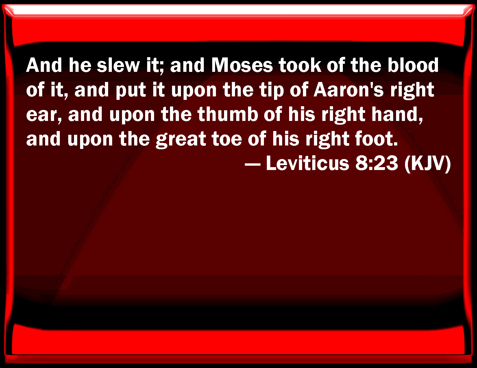 Bible Verse Slide Leviticus 8:23 And he slew it; and Moses took of the blood of it, and put it on the tip of Aaron's right ear, and on the thumb of his right hand, and on the great toe of his right foot. KJV: And he slew it; and Moses took of the blood of it, and put it upon the tip of Aaron's right ear, and upon the thumb of his right hand, and upon the great toe of his right foot. DRB: And when Moses had immolated it, he took of the blood thereof, and touched the tip of Aaron's right ear, and the thumb of his right hand, and in like manner also the great toe of his right foot. DBT: and one slaughtered it; and Moses took of its blood, and put it on the tip of Aaron's right ear, and on the thumb of his right hand, and on the great toe of his right foot; ERV: And he slew it; and Moses took of the blood thereof, and put it upon the tip of Aaron's right ear, and upon the thumb of his right hand, and upon the great toe of his right foot. WBT: And he slew it; and Moses took of its blood, and put it upon the tip of Aaron's right ear, and upon the thumb of his right hand, and upon the great toe of his right foot. WEB: He killed it; and Moses took some of its blood, and put it on the tip of Aaron's right ear, and on the thumb of his right hand, and on the great toe of his right foot. YLT: and one slaughtereth, and Moses taketh of its blood, and putteth on the tip of the right ear of Aaron, and on the thumb of his right hand, and on the great toe of his right foot;Links Leviticus 8:23 NIV • Leviticus 8:23 NLT • Leviticus 8:23 ESV • Leviticus 8:23 NASB • Leviticus 8:23 KJV • Leviticus 8:23 Interlinear • Leviticus 8:23 Commentaries • Leviticus 8:23 Parallel Texts • Leviticus 8:23 Bible Apps • Leviticus 8:23 Parallel • Bible Hub |