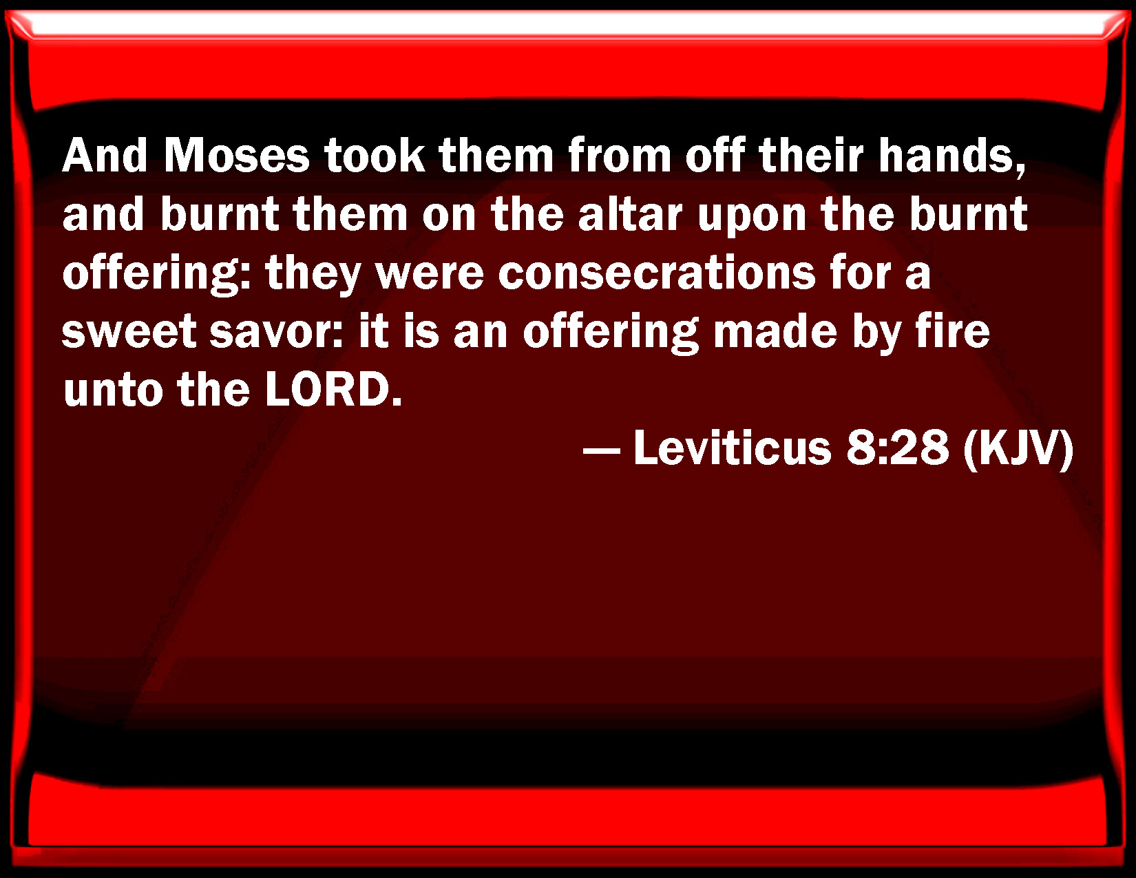 WBT:  And Moses took them from off their hands, and burnt them on the altar upon the burnt-offering: they were consecrations for a sweet savor: it is an offering made by fire to the LORD.