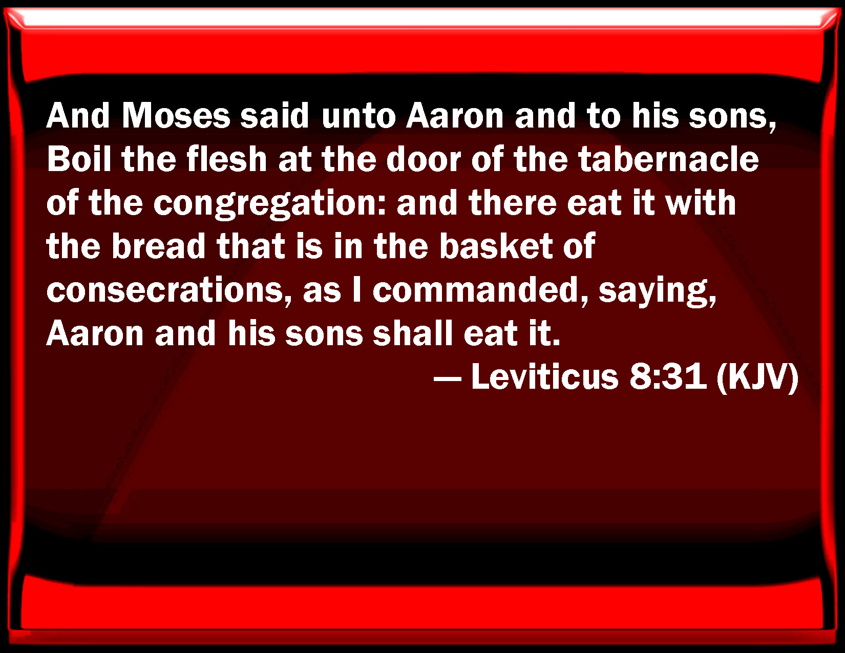 Bible Verse Slide Leviticus 8:31 And Moses said to Aaron and to his sons, Boil the flesh at the door of the tabernacle of the congregation: and there eat it with the bread that is in the basket of consecrations, as I commanded, saying, Aaron and his sons shall eat it. KJV: And Moses said unto Aaron and to his sons, Boil the flesh at the door of the tabernacle of the congregation: and there eat it with the bread that is in the basket of consecrations, as I commanded, saying, Aaron and his sons shall eat it. DRB: And when he had sanctified them in their vestments, he commanded them, saying: Boil the flesh before the door of the tabernacle, and there eat it. Eat ye also the loaves of consecration, that are laid in the basket, as the Lord commanded me, saying: Aaron and his sons shall eat them: DBT: And Moses spoke to Aaron and to his sons, Boil the flesh at the entrance of the tent of meeting; and there eat it and the bread that is in the basket of the consecration-offering, as I commanded, saying, Aaron and his sons shall eat it. ERV: And Moses said unto Aaron and to his sons, Boil the flesh at the door of the tent of meeting: and there eat it and the bread that is in the basket of consecration, as I commanded, saying, Aaron and his sons shall eat it. WBT: And Moses said to Aaron and to his sons, Boil the flesh at the door of the tabernacle of the congregation; and there eat it with the bread that is in the basket of consecrations, as I commanded, saying, Aaron and his sons shall eat it. WEB: Moses said to Aaron and to his sons, "Boil the flesh at the door of the Tent of Meeting, and there eat it and the bread that is in the basket of consecration, as I commanded, saying, 'Aaron and his sons shall eat it.' YLT: And Moses saith unto Aaron, and unto his sons, 'Boil ye the flesh at the opening of the tent of meeting, and there ye do eat it and the bread which is in the basket of the consecrations, as I have commanded, saying, Aaron and his sons do eat it.Links Leviticus 8:31 NIV • Leviticus 8:31 NLT • Leviticus 8:31 ESV • Leviticus 8:31 NASB • Leviticus 8:31 KJV • Leviticus 8:31 Interlinear • Leviticus 8:31 Commentaries • Leviticus 8:31 Parallel Texts • Leviticus 8:31 Bible Apps • Leviticus 8:31 Parallel • Bible Hub |