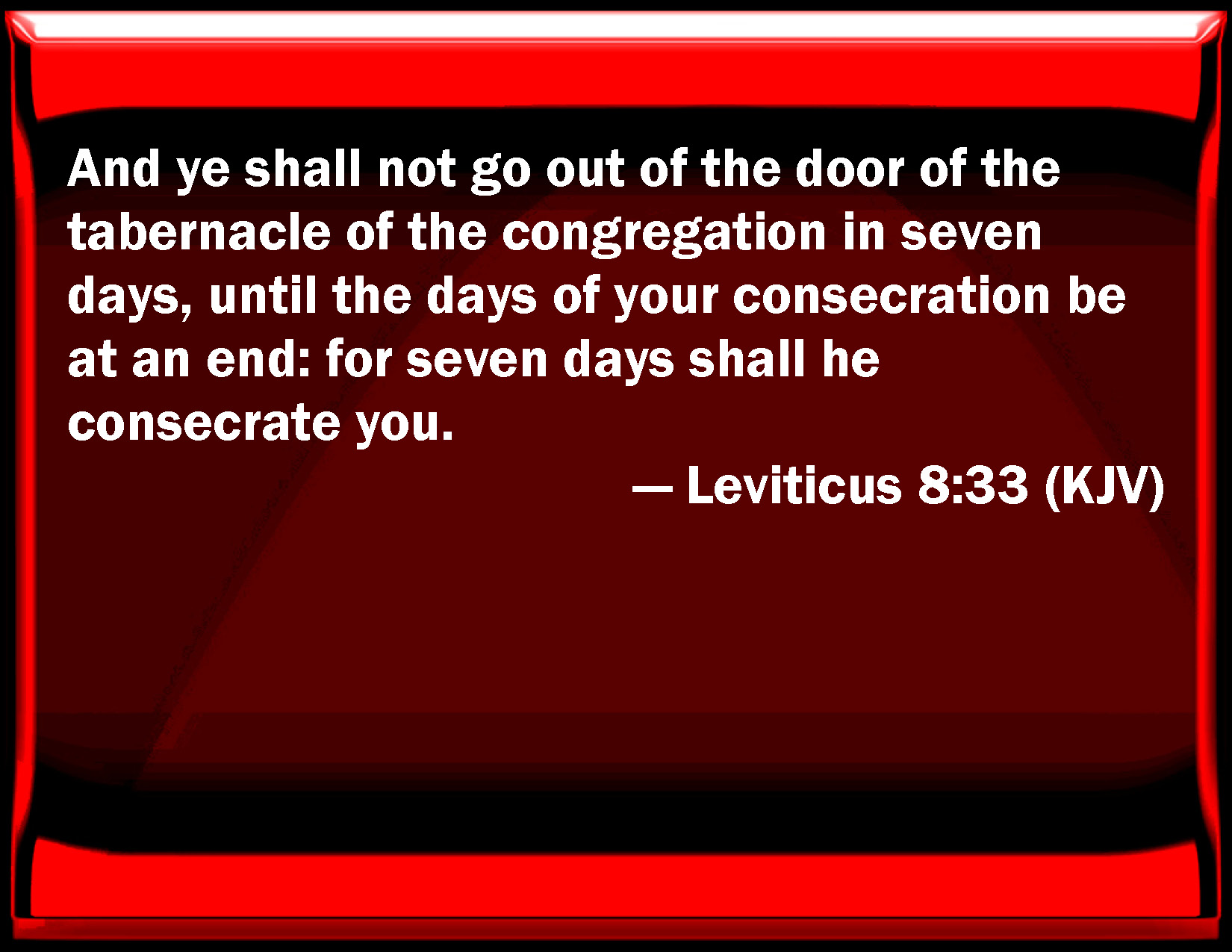 Leviticus 8:33 And you shall not go out of the door of the tabernacle of the congregation in seven days, until the days of your consecration be at an end: for seven days shall he consecrate you.