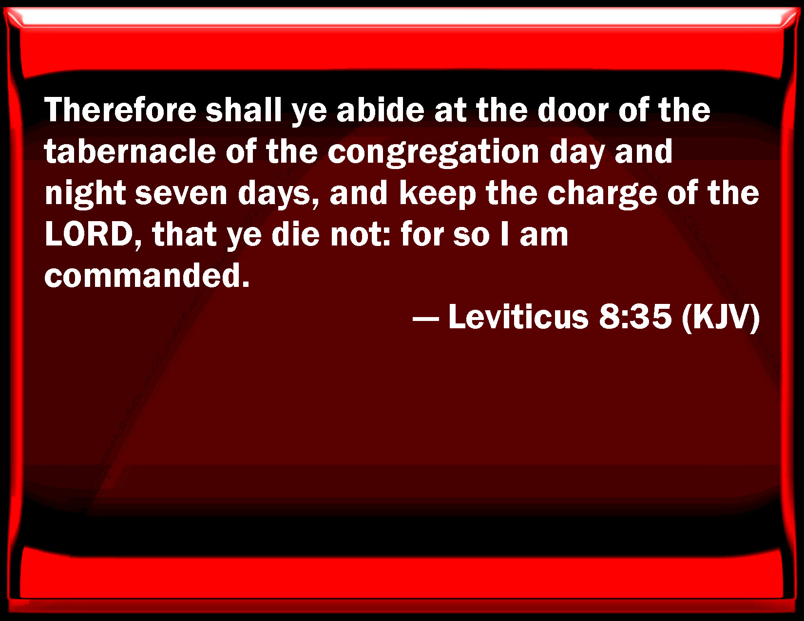 Bible Verse Slide Leviticus 8:35 Therefore shall you abide at the door of the tabernacle of the congregation day and night seven days, and keep the charge of the LORD, that you die not: for so I am commanded. KJV: Therefore shall ye abide at the door of the tabernacle of the congregation day and night seven days, and keep the charge of the LORD, that ye die not: for so I am commanded. DRB: Day and night shall you remain in the tabernacle observing the watches of the Lord, lest you die: for so it hath been commanded me. DBT: And ye shall abide at the entrance of the tent of meeting day and night seven days, and keep the charge of Jehovah, that ye die not; for so I am commanded. ERV: And at the door of the tent of meeting shall ye abide day and night seven days, and keep the charge of the LORD, that ye die not: for so I am commanded. WBT: Therefore shall ye abide at the door of the tabernacle of the congregation day and night seven days, and keep the charge of the LORD, that ye die not: for so I am commanded. WEB: You shall stay at the door of the Tent of Meeting day and night seven days, and keep Yahweh's command, that you don't die: for so I am commanded." YLT: and at the opening of the tent of meeting ye abide, by day and by night seven days, and ye have kept the charge of Jehovah, and die not, for so I have been commanded.'Links Leviticus 8:35 NIV • Leviticus 8:35 NLT • Leviticus 8:35 ESV • Leviticus 8:35 NASB • Leviticus 8:35 KJV • Leviticus 8:35 Interlinear • Leviticus 8:35 Commentaries • Leviticus 8:35 Parallel Texts • Leviticus 8:35 Bible Apps • Leviticus 8:35 Parallel • Bible Hub |