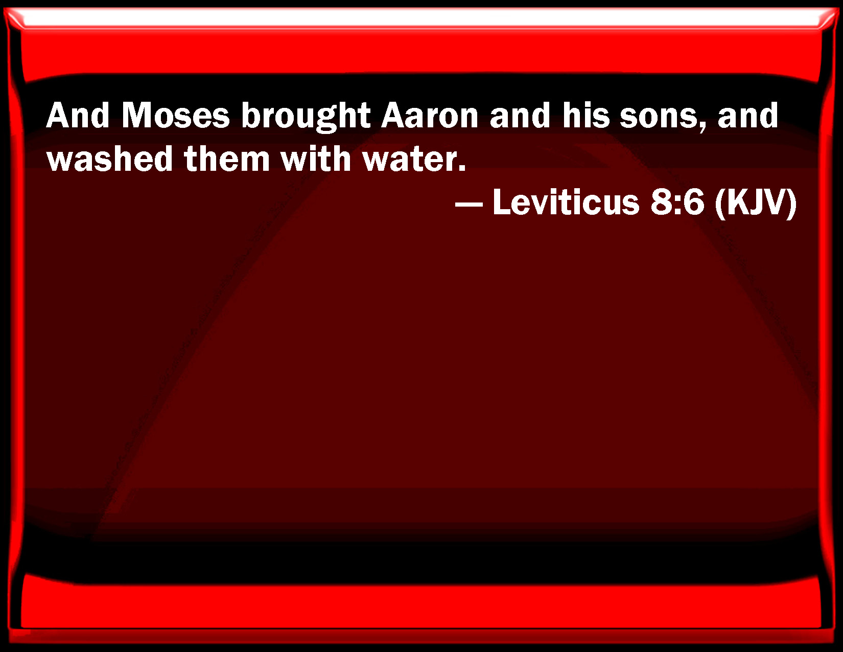 Bible Verse Slide Leviticus 8:6 And Moses brought Aaron and his sons, and washed them with water. KJV: And Moses brought Aaron and his sons, and washed them with water. DRB: And immediately he offered Aaron and his sons: and when he had washed them, DBT: And Moses brought Aaron near, and his sons, and bathed them with water. ERV: And Moses brought Aaron and his sons, and washed them with water. WBT: And Moses brought Aaron and his sons, and washed them with water. WEB: Moses brought Aaron and his sons, and washed them with water. YLT: And Moses bringeth near Aaron and his sons, and doth bathe them with water,Links Leviticus 8:6 NIV • Leviticus 8:6 NLT • Leviticus 8:6 ESV • Leviticus 8:6 NASB • Leviticus 8:6 KJV • Leviticus 8:6 Interlinear • Leviticus 8:6 Commentaries • Leviticus 8:6 Parallel Texts • Leviticus 8:6 Bible Apps • Leviticus 8:6 Parallel • Bible Hub |