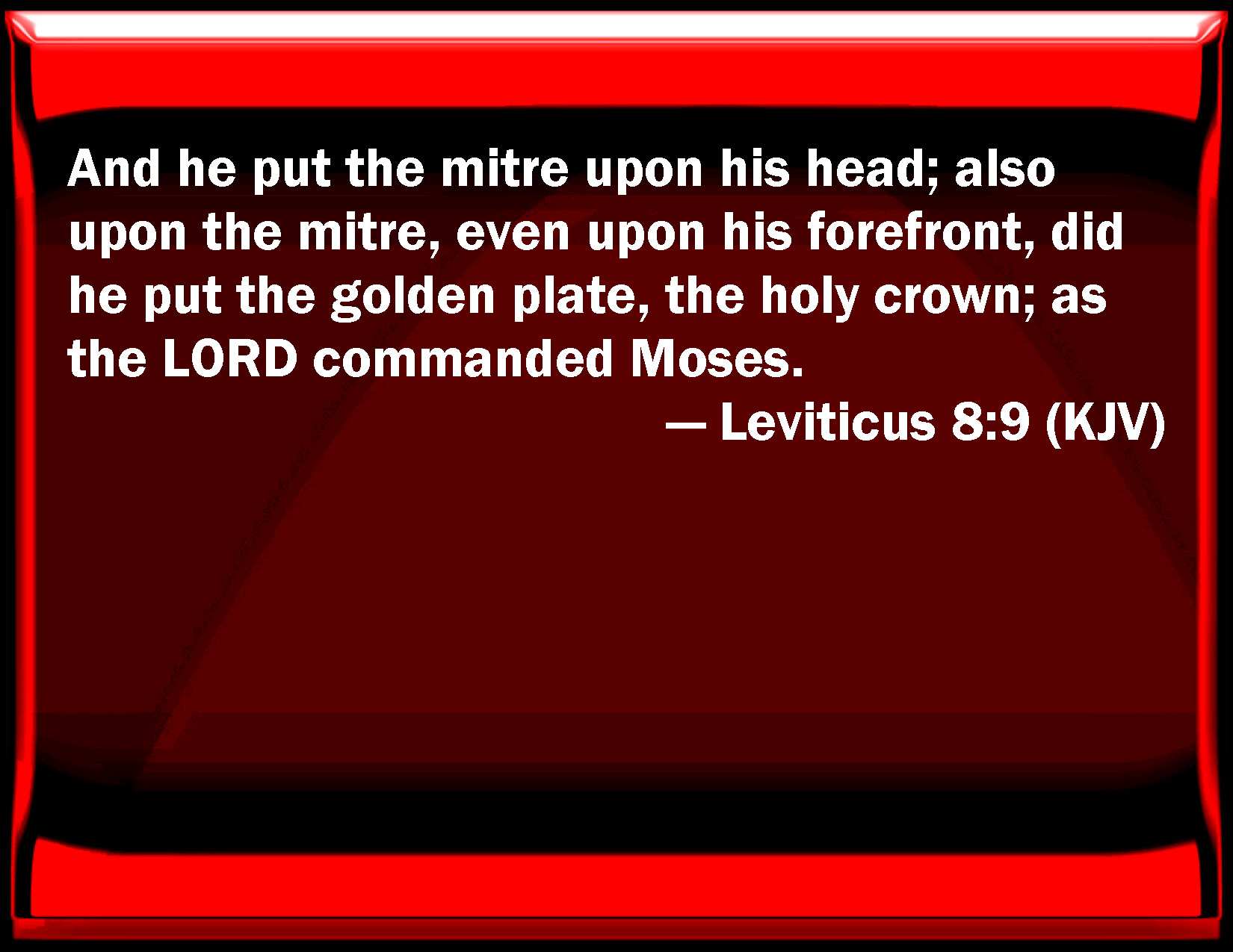 Bible Verse Slide Leviticus 8:9 And he put the turban on his head; also on the turban, even on his forefront, did he put the golden plate, the holy crown; as the LORD commanded Moses. KJV: And he put the mitre upon his head; also upon the mitre, even upon his forefront, did he put the golden plate, the holy crown; as the LORD commanded Moses. DRB: He put also the mitre upon his head: and upon the mitre over the forehead, he put the plate of gold, consecrated with sanctification, as the Lord had commanded him. DBT: and he put the turban upon his head; and upon the turban, on the front of it, he put the golden plate, the holy diadem; as Jehovah had commanded Moses. ERV: And he set the mitre upon his head; and upon the mitre, in front, did he set the golden plate, the holy crown; as the LORD commanded Moses. WBT: And he put the miter upon his head; also upon the miter, even upon his front, did he put the golden plate, the holy crown; as the LORD commanded Moses. WEB: He set the turban on his head; and on the turban, in front, he set the golden plate, the holy crown; as Yahweh commanded Moses. YLT: and doth put the mitre on his head, and doth put on the mitre, over-against its front, the golden flower of the holy crown, as Jehovah hath commanded Moses.Links Leviticus 8:9 NIV • Leviticus 8:9 NLT • Leviticus 8:9 ESV • Leviticus 8:9 NASB • Leviticus 8:9 KJV • Leviticus 8:9 Interlinear • Leviticus 8:9 Commentaries • Leviticus 8:9 Parallel Texts • Leviticus 8:9 Bible Apps • Leviticus 8:9 Parallel • Bible Hub |