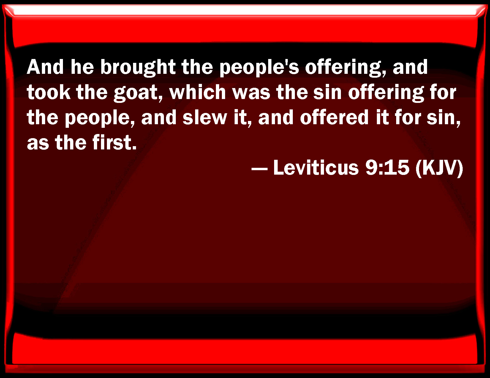 Bible Verse Slide Leviticus 9:15 And he brought the people's offering, and took the goat, which was the sin offering for the people, and slew it, and offered it for sin, as the first. KJV: And he brought the people's offering, and took the goat, which was the sin offering for the people, and slew it, and offered it for sin, as the first. DRB: Then offering for the sin of the people, he slew the he goat: and expiating the altar, DBT: And he presented the people's offering, and took the goat of the sin-offering which was for the people and slaughtered it, and offered it for sin, as the first. ERV: And he presented the people's oblation, and took the goat of the sin offering which was for the people, and slew it, and offered it for sin, as the first. WBT: And he brought the people's offering, and took the goat, which was the sin-offering for the people, and slew it, and offered it for sin, as the first. WEB: He presented the people's offering, and took the goat of the sin offering which was for the people, and killed it, and offered it for sin, like the first. YLT: And he bringeth near the offering of the people, and taketh the goat of the sin-offering which is for the people, and slaughtered it, and maketh it a sin-offering, like the first;Links Leviticus 9:15 NIV • Leviticus 9:15 NLT • Leviticus 9:15 ESV • Leviticus 9:15 NASB • Leviticus 9:15 KJV • Leviticus 9:15 Interlinear • Leviticus 9:15 Commentaries • Leviticus 9:15 Parallel Texts • Leviticus 9:15 Bible Apps • Leviticus 9:15 Parallel • Bible Hub |