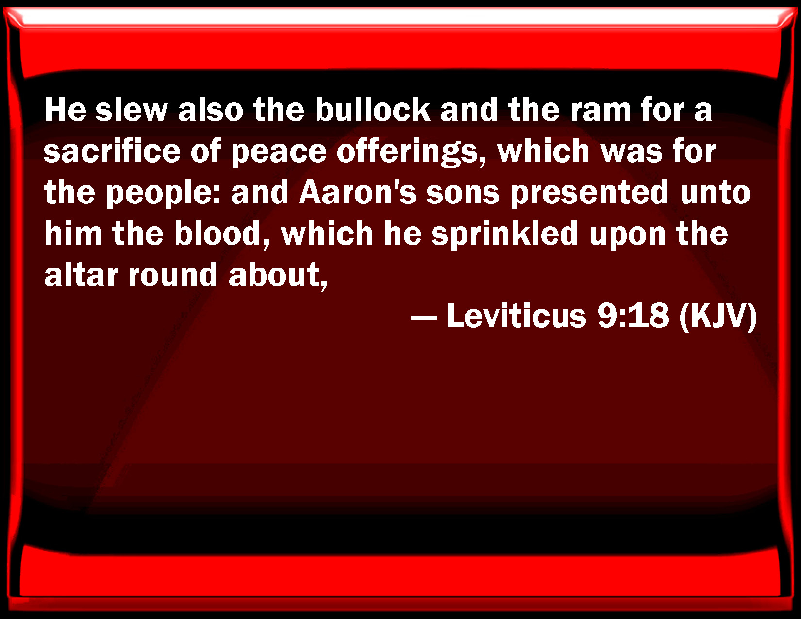 Bible Verse Slide Leviticus 9:18 He slew also the bullock and the ram for a sacrifice of peace offerings, which was for the people: and Aaron's sons presented to him the blood, which he sprinkled on the altar round about, KJV: He slew also the bullock and the ram for a sacrifice of peace offerings, which was for the people: and Aaron's sons presented unto him the blood, which he sprinkled upon the altar round about, DRB: He immolated also the bullock and the ram, the peace offerings of the people: and his sons brought him the blood, which he poured upon the altar round about. DBT: And he slaughtered the bullock and the ram of the sacrifice of peace-offering which was for the people. And Aaron's sons delivered to him the blood, and he sprinkled it on the altar round about; ERV: He slew also the ox and the ram, the sacrifice of peace offerings, which was for the people: and Aaron's sons delivered unto him the blood, and he sprinkled it upon the altar round about, WBT: He slew also the bullock and the ram for a sacrifice of peace-offerings, which was for the people: and Aaron's sons presented to him the blood, which he sprinkled around upon the altar, WEB: He also killed the bull and the ram, the sacrifice of peace offerings, which was for the people: and Aaron's sons delivered to him the blood, which he sprinkled around on the altar, YLT: And he slaughtereth the bullock and the ram, a sacrifice of the peace-offerings, which are for the people, and sons of Aaron present the blood unto him (and he sprinkleth it on the altar round about),Links Leviticus 9:18 NIV • Leviticus 9:18 NLT • Leviticus 9:18 ESV • Leviticus 9:18 NASB • Leviticus 9:18 KJV • Leviticus 9:18 Interlinear • Leviticus 9:18 Commentaries • Leviticus 9:18 Parallel Texts • Leviticus 9:18 Bible Apps • Leviticus 9:18 Parallel • Bible Hub |