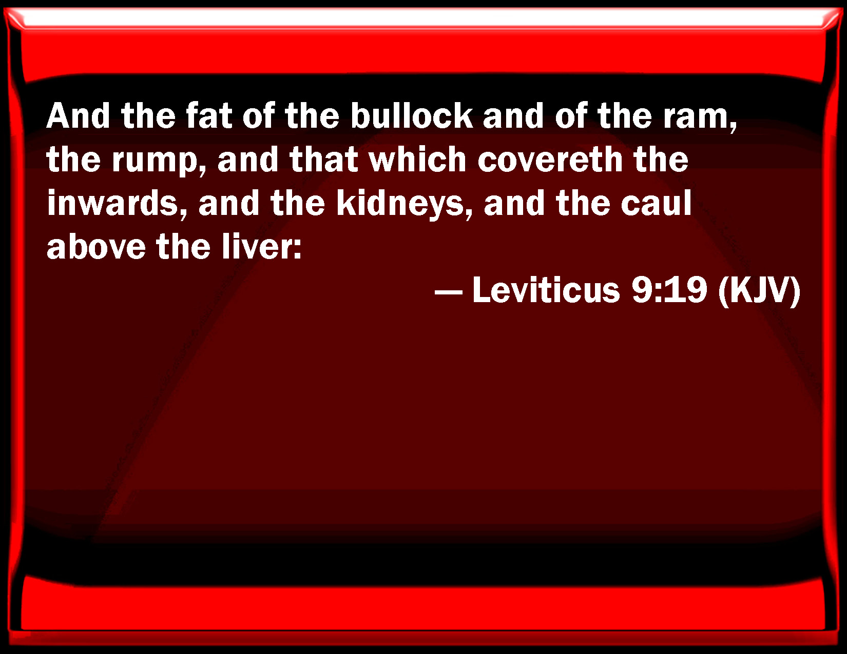 Bible Verse Slide Leviticus 9:19 And the fat of the bullock and of the ram, the rump, and that which covers the inwards, and the kidneys, and the lobe above the liver: KJV: And the fat of the bullock and of the ram, the rump, and that which covereth the inwards, and the kidneys, and the caul above the liver: DRB: The fat also of the bullock, and the rump of the ram, and the two little kidneys, with their fat, and the caul of the liver, DBT: and the pieces of fat of the bullock and of the ram, the fat tail and what covers the inwards, and the kidneys, and the net of the liver; ERV: and the fat of the ox; and of the ram, the fat tail, and that which covereth the inwards, and the kidneys, and the caul of the liver: WBT: And the fat of the bullock, and of the ram, the rump, and that which covereth the inwards, and the kidneys, and the caul above the liver: WEB: and the fat of the bull and of the ram, the fat tail, and that which covers the innards, and the kidneys, and the cover of the liver: YLT: and the fat of the bullock, and of the ram, the fat tail, and the covering of the inwards, and the kidneys, and the redundance above the liver,Links Leviticus 9:19 NIV • Leviticus 9:19 NLT • Leviticus 9:19 ESV • Leviticus 9:19 NASB • Leviticus 9:19 KJV • Leviticus 9:19 Interlinear • Leviticus 9:19 Commentaries • Leviticus 9:19 Parallel Texts • Leviticus 9:19 Bible Apps • Leviticus 9:19 Parallel • Bible Hub |