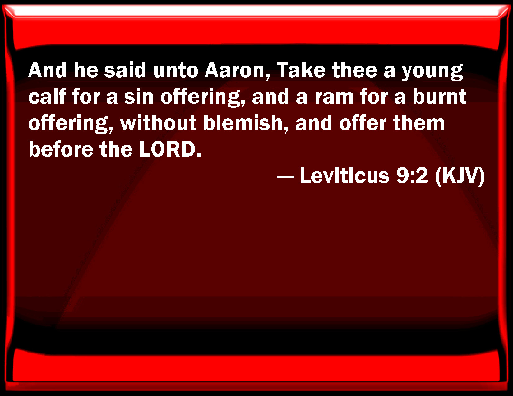 Bible Verse Slide Leviticus 9:2 And he said to Aaron, Take you a young calf for a sin offering, and a ram for a burnt offering, without blemish, and offer them before the LORD. KJV: And he said unto Aaron, Take thee a young calf for a sin offering, and a ram for a burnt offering, without blemish, and offer them before the LORD. DRB: Take of the herd a calf for sin, and a ram for a holocaust, both without blemish, and offer them before the Lord. DBT: and said to Aaron, Take thee a young calf for a sin-offering, and a ram for a burnt-offering, without blemish, and present them before Jehovah; ERV: and he said unto Aaron, Take thee a bull calf for a sin offering, and a ram for a burnt offering, without blemish, and offer them before the LORD. WBT: And he said to Aaron, Take thee a young calf for a sin-offering, and a ram for a burnt-offering, without blemish, and offer them before the LORD. WEB: and he said to Aaron, "Take a calf from the herd for a sin offering, and a ram for a burnt offering, without blemish, and offer them before Yahweh. YLT: and he saith unto Aaron, 'Take to thyself a calf, a son of the herd, for a sin-offering, and a ram for a burnt-offering, perfect ones, and bring near before Jehovah.Links Leviticus 9:2 NIV • Leviticus 9:2 NLT • Leviticus 9:2 ESV • Leviticus 9:2 NASB • Leviticus 9:2 KJV • Leviticus 9:2 Interlinear • Leviticus 9:2 Commentaries • Leviticus 9:2 Parallel Texts • Leviticus 9:2 Bible Apps • Leviticus 9:2 Parallel • Bible Hub |