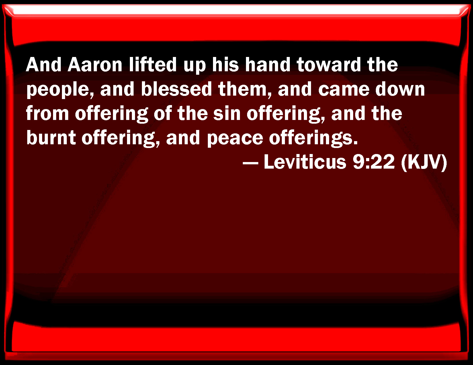Bible Verse Slide Leviticus 9:22 And Aaron lifted up his hand toward the people, and blessed them, and came down from offering of the sin offering, and the burnt offering, and peace offerings. KJV: And Aaron lifted up his hand toward the people, and blessed them, and came down from offering of the sin offering, and the burnt offering, and peace offerings. DRB: And stretching forth his hands to the people, he blessed them. And so the victims for sin, and the holocausts, and the peace offerings being finished, he came down. DBT: And Aaron lifted up his hands toward the people and blessed them, and came down after the offering of the sin-offering, and the burnt-offering, and the peace-offering. ERV: And Aaron lifted up his hands toward the people, and blessed them; and he came down from offering the sin offering, and the burnt offering, and the peace offerings. WBT: And Aaron lifted up his hand towards the people, and blessed them; and came down from offering the sin-offering, and the burnt-offering, and peace-offerings. WEB: Aaron lifted up his hands toward the people, and blessed them; and he came down from offering the sin offering, and the burnt offering, and the peace offerings. YLT: And Aaron lifteth up his hand towards the people, and blesseth them, and cometh down from making the sin-offering, and the burnt-offering, and the peace-offerings.Links Leviticus 9:22 NIV • Leviticus 9:22 NLT • Leviticus 9:22 ESV • Leviticus 9:22 NASB • Leviticus 9:22 KJV • Leviticus 9:22 Interlinear • Leviticus 9:22 Commentaries • Leviticus 9:22 Parallel Texts • Leviticus 9:22 Bible Apps • Leviticus 9:22 Parallel • Bible Hub |