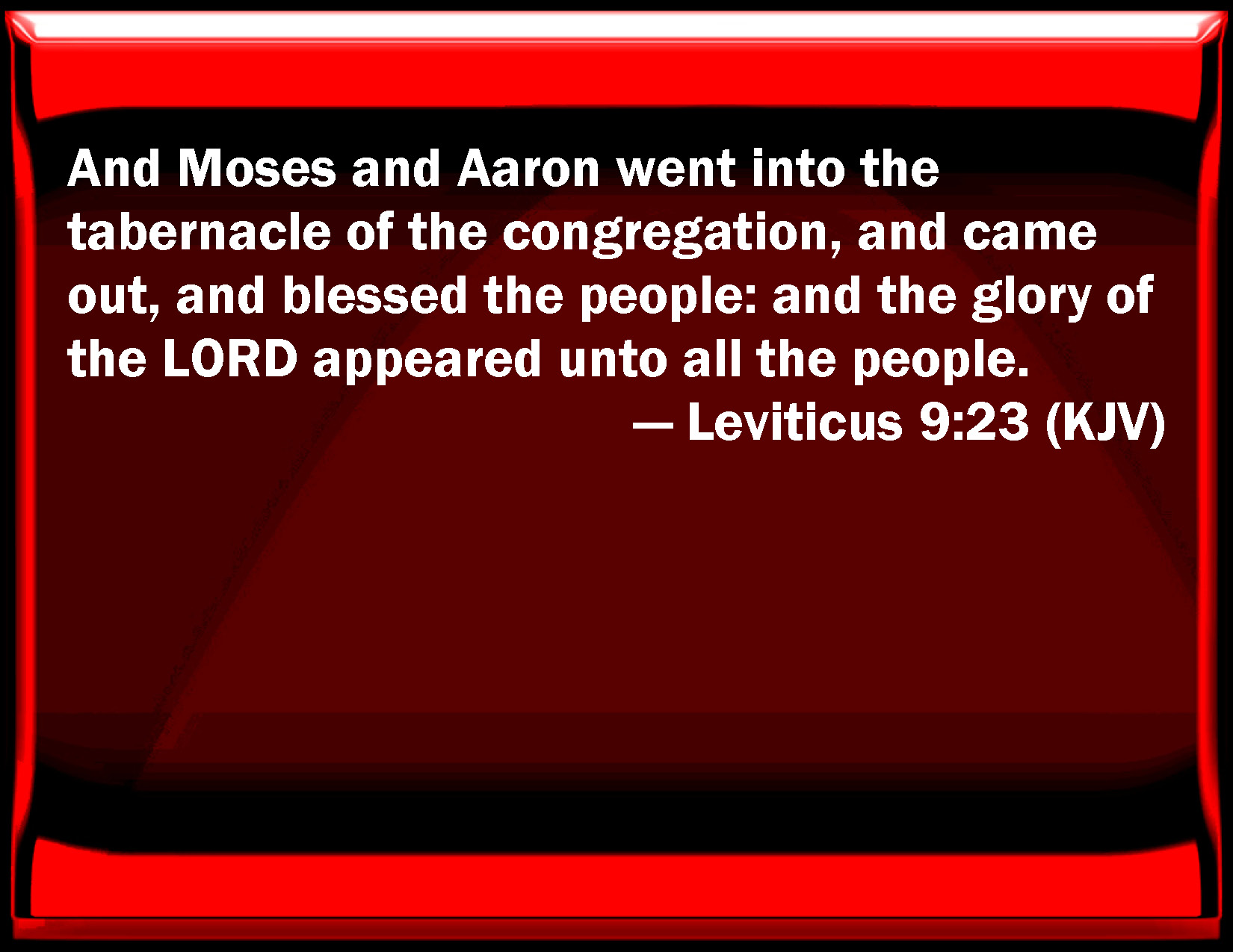 Bible Verse Slide Leviticus 9:23 And Moses and Aaron went into the tabernacle of the congregation, and came out, and blessed the people: and the glory of the LORD appeared to all the people. KJV: And Moses and Aaron went into the tabernacle of the congregation, and came out, and blessed the people: and the glory of the LORD appeared unto all the people. DRB: And Moses and Aaron went into the tabernacle of the testimony, and afterwards came forth and blessed the people. And the glory of the Lord appeared to all the multitude: DBT: And Moses and Aaron went into the tent of meeting, and came out and blessed the people; and the glory of Jehovah appeared to all the people. ERV: And Moses and Aaron went into the tent of meeting, and came out, and blessed the people: and the glory of the LORD appeared unto all the people. WBT: And Moses and Aaron went into the tabernacle of the congregation, and came out, and blessed the people: and the glory of the LORD appeared to all the people. WEB: Moses and Aaron went into the Tent of Meeting, and came out, and blessed the people: and the glory of Yahweh appeared to all the people. YLT: And Moses goeth in — Aaron also — unto the tent of meeting, and they come out, and bless the people, and the honour of Jehovah appeareth unto all the people;Links Leviticus 9:23 NIV • Leviticus 9:23 NLT • Leviticus 9:23 ESV • Leviticus 9:23 NASB • Leviticus 9:23 KJV • Leviticus 9:23 Interlinear • Leviticus 9:23 Commentaries • Leviticus 9:23 Parallel Texts • Leviticus 9:23 Bible Apps • Leviticus 9:23 Parallel • Bible Hub |