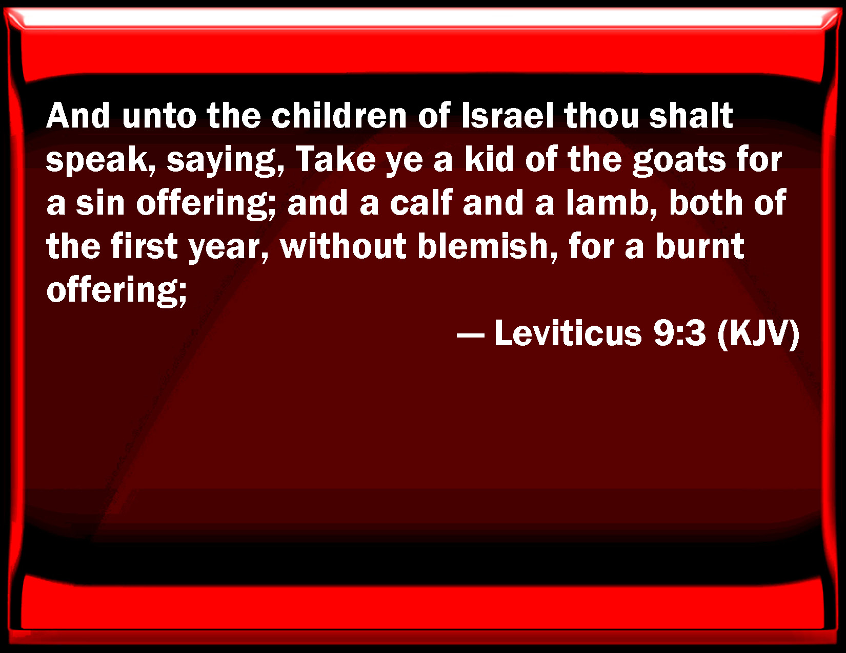 Bible Verse Slide Leviticus 9:3 And to the children of Israel you shall speak, saying, Take you a kid of the goats for a sin offering; and a calf and a lamb, both of the first year, without blemish, for a burnt offering; KJV: And unto the children of Israel thou shalt speak, saying, Take ye a kid of the goats for a sin offering; and a calf and a lamb, both of the first year, without blemish, for a burnt offering; DRB: And to the children of Israel thou shalt say: Take ye a he goat for sin, and a calf, and a lamb, both of a year old, and without blemish for a holocaust, DBT: and to the children of Israel shalt thou speak, saying, Take a buck of the goats for a sin-offering, and a calf and a lamb, yearlings, without blemish, for a burnt-offering; ERV: And unto the children of Israel thou shalt speak, saying, Take ye a he-goat for a sin offering; and a calf and a lamb, both of the first year, without blemish, for a burnt offering; WBT: And to the children of Israel thou shalt speak, saying, Take ye a kid of the goats for a sin-offering; and a calf and a lamb, both of the first year, without blemish, for a burnt-offering; WEB: You shall speak to the children of Israel, saying, 'Take a male goat for a sin offering; and a calf and a lamb, both a year old, without blemish, for a burnt offering; YLT: 'And unto the sons of Israel thou dost speak, saying, Take ye a kid of the goats for a sin-offering, and a calf, and a lamb, sons of a year, perfect ones, for a burnt-offering,Links Leviticus 9:3 NIV • Leviticus 9:3 NLT • Leviticus 9:3 ESV • Leviticus 9:3 NASB • Leviticus 9:3 KJV • Leviticus 9:3 Interlinear • Leviticus 9:3 Commentaries • Leviticus 9:3 Parallel Texts • Leviticus 9:3 Bible Apps • Leviticus 9:3 Parallel • Bible Hub |