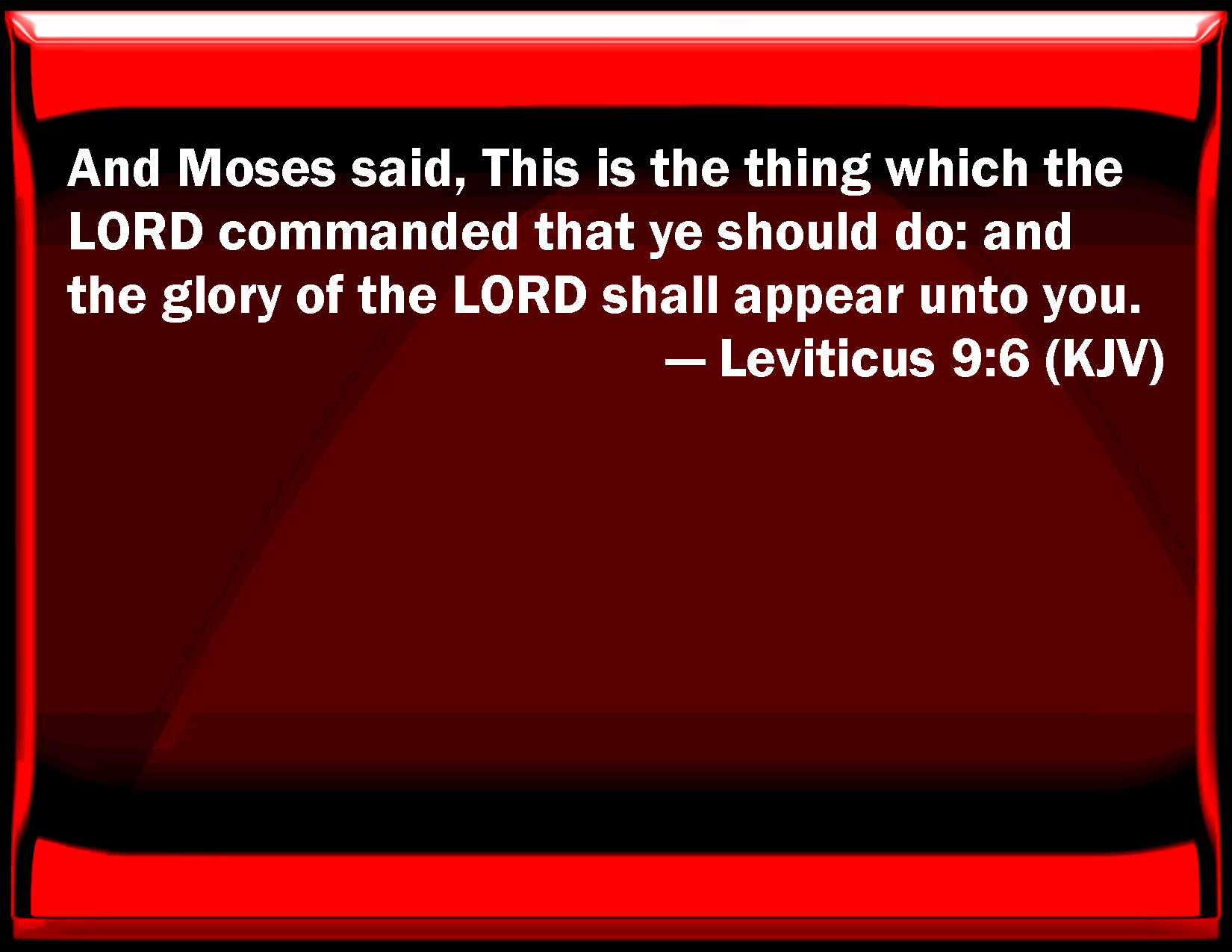 Bible Verse Slide Leviticus 9:6 And Moses said, This is the thing which the LORD commanded that you should do: and the glory of the LORD shall appear to you. KJV: And Moses said, This is the thing which the LORD commanded that ye should do: and the glory of the LORD shall appear unto you. DRB: Moses said: This is the word, which the Lord hath commanded: do it, and his glory will appear to you. DBT: And Moses said, This is the thing which Jehovah has commanded that ye should do; and the glory of Jehovah shall appear to you. ERV: And Moses said, This is the thing which the LORD commanded that ye should do: and the glory of the LORD shall appear unto you. WBT: And Moses said, This is the thing which the LORD commanded that ye should do: and the glory of the LORD shall appear to you. WEB: Moses said, "This is the thing which Yahweh commanded that you should do: and the glory of Yahweh shall appear to you." YLT: and Moses saith, 'This is the thing which Jehovah hath commanded; do it, and the honour of Jehovah doth appear unto you.'Links Leviticus 9:6 NIV • Leviticus 9:6 NLT • Leviticus 9:6 ESV • Leviticus 9:6 NASB • Leviticus 9:6 KJV • Leviticus 9:6 Interlinear • Leviticus 9:6 Commentaries • Leviticus 9:6 Parallel Texts • Leviticus 9:6 Bible Apps • Leviticus 9:6 Parallel • Bible Hub |