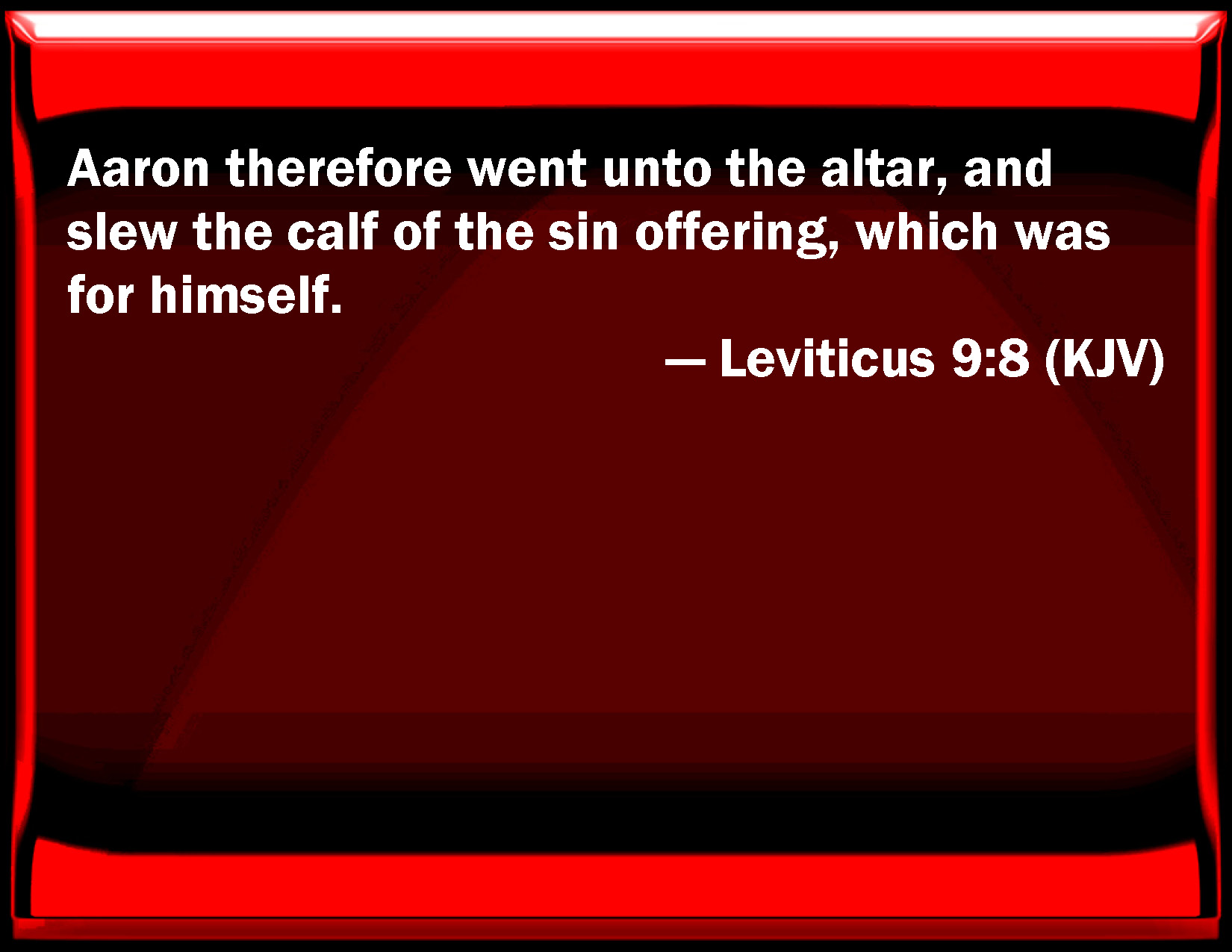 Bible Verse Slide Leviticus 9:8 Aaron therefore went to the altar, and slew the calf of the sin offering, which was for himself. KJV: Aaron therefore went unto the altar, and slew the calf of the sin offering, which was for himself. DRB: And forthwith Aaron, approaching to the altar, immolated the calf for his sin: DBT: And Aaron went to the altar and slaughtered the calf of the sin-offering which was for himself; ERV: So Aaron drew near unto the altar, and slew the calf of the sin offering, which was for himself. WBT: Aaron therefore went to the altar, and slew the calf of the sin-offering, which was for himself. WEB: So Aaron drew near to the altar, and killed the calf of the sin offering, which was for himself. YLT: And Aaron draweth near unto the altar, and slaughtereth the calf of the sin-offering, which is for himself;Links Leviticus 9:8 NIV • Leviticus 9:8 NLT • Leviticus 9:8 ESV • Leviticus 9:8 NASB • Leviticus 9:8 KJV • Leviticus 9:8 Interlinear • Leviticus 9:8 Commentaries • Leviticus 9:8 Parallel Texts • Leviticus 9:8 Bible Apps • Leviticus 9:8 Parallel • Bible Hub |