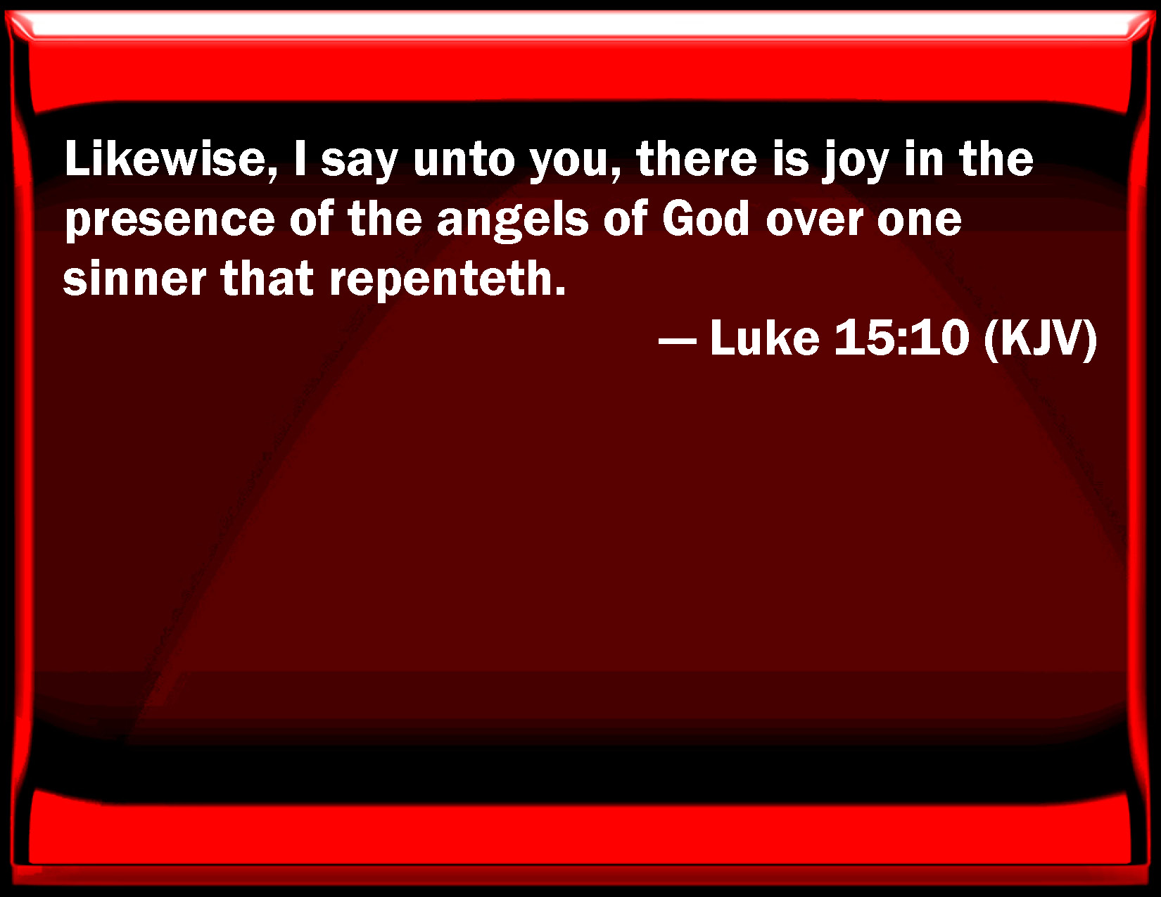 Bible Verse Slide Luke 15:10 Likewise, I say to you, there is joy in the presence of the angels of God over one sinner that repents. KJV: Likewise, I say unto you, there is joy in the presence of the angels of God over one sinner that repenteth. DRB: So I say to you, there shall be joy before the angels of God upon one sinner doing penance. DBT: Thus, I say unto you, there is joy before the angels of God for one repenting sinner. ERV: Even so, I say unto you, there is joy in the presence of the angels of God over one sinner that repenteth. WBT: Likewise, I say to you, There is joy in the presence of the angels of God over one sinner that repenteth. WEB: Even so, I tell you, there is joy in the presence of the angels of God over one sinner repenting." YLT: 'So I say to you, joy doth come before the messengers of God over one sinner reforming.'Links Luke 15:10 NIV • Luke 15:10 NLT • Luke 15:10 ESV • Luke 15:10 NASB • Luke 15:10 KJV • Luke 15:10 Interlinear • Luke 15:10 Commentaries • Luke 15:10 Parallel Texts • Luke 15:10 Bible Apps • Luke 15:10 Parallel • Bible Hub |