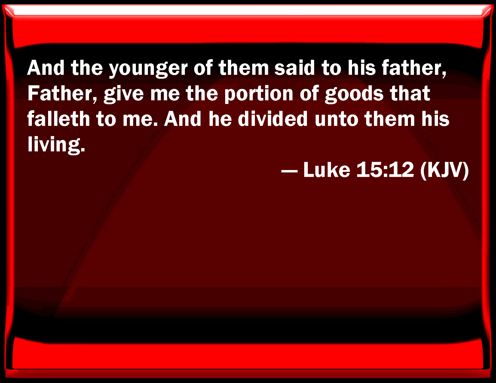 Bible Verse Slide Luke 15:12 And the younger of them said to his father, Father, give me the portion of goods that falls to me. And he divided to them his living. KJV: And the younger of them said to his father, Father, give me the portion of goods that falleth to me. And he divided unto them his living. DRB: And the younger of them said to his father: Father, give me the portion of substance that falleth to me. And he divided unto them his substance. DBT: and the younger of them said to his father, Father, give to me the share of the property that falls to me. And he divided to them what he was possessed of. ERV: and the younger of them said to his father, Father, give me the portion of thy substance that falleth to me. And he divided unto them his living. WBT: And the younger of them said to his father, Father, give me the portion of goods that falleth to me. And he divided to them his living. WEB: The younger of them said to his father, 'Father, give me my share of your property.' He divided his livelihood between them. YLT: and the younger of them said to the father, Father, give me the portion of the substance falling to me, and he divided to them the living.Links Luke 15:12 NIV • Luke 15:12 NLT • Luke 15:12 ESV • Luke 15:12 NASB • Luke 15:12 KJV • Luke 15:12 Interlinear • Luke 15:12 Commentaries • Luke 15:12 Parallel Texts • Luke 15:12 Bible Apps • Luke 15:12 Parallel • Bible Hub |