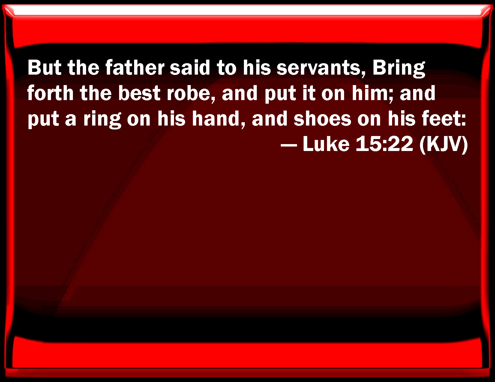 Bible Verse Slide Luke 15:22 But the father said to his servants, Bring forth the best robe, and put it on him; and put a ring on his hand, and shoes on his feet: KJV: But the father said to his servants, Bring forth the best robe, and put it on him; and put a ring on his hand, and shoes on his feet: DRB: And the father said to his servants: Bring forth quickly the first robe, and put it on him, and put a ring on his hand, and shoes on his feet: DBT: But the father said to his bondmen, Bring out the best robe and clothe him in it, and put a ring on his hand and sandals on his feet; ERV: But the father said to his servants, Bring forth quickly the best robe, and put it on him; and put a ring on his hand, and shoes on his feet: WBT: But the father said to his servants, Bring forth the best robe, and put it on him, and put a ring on his hand, and shoes on his feet: WEB: "But the father said to his servants, 'Bring out the best robe, and put it on him. Put a ring on his hand, and shoes on his feet. YLT: 'And the father said unto his servants, Bring forth the first robe, and clothe him, and give a ring for his hand, and sandals for the feet;Links Luke 15:22 NIV • Luke 15:22 NLT • Luke 15:22 ESV • Luke 15:22 NASB • Luke 15:22 KJV • Luke 15:22 Interlinear • Luke 15:22 Commentaries • Luke 15:22 Parallel Texts • Luke 15:22 Bible Apps • Luke 15:22 Parallel • Bible Hub |