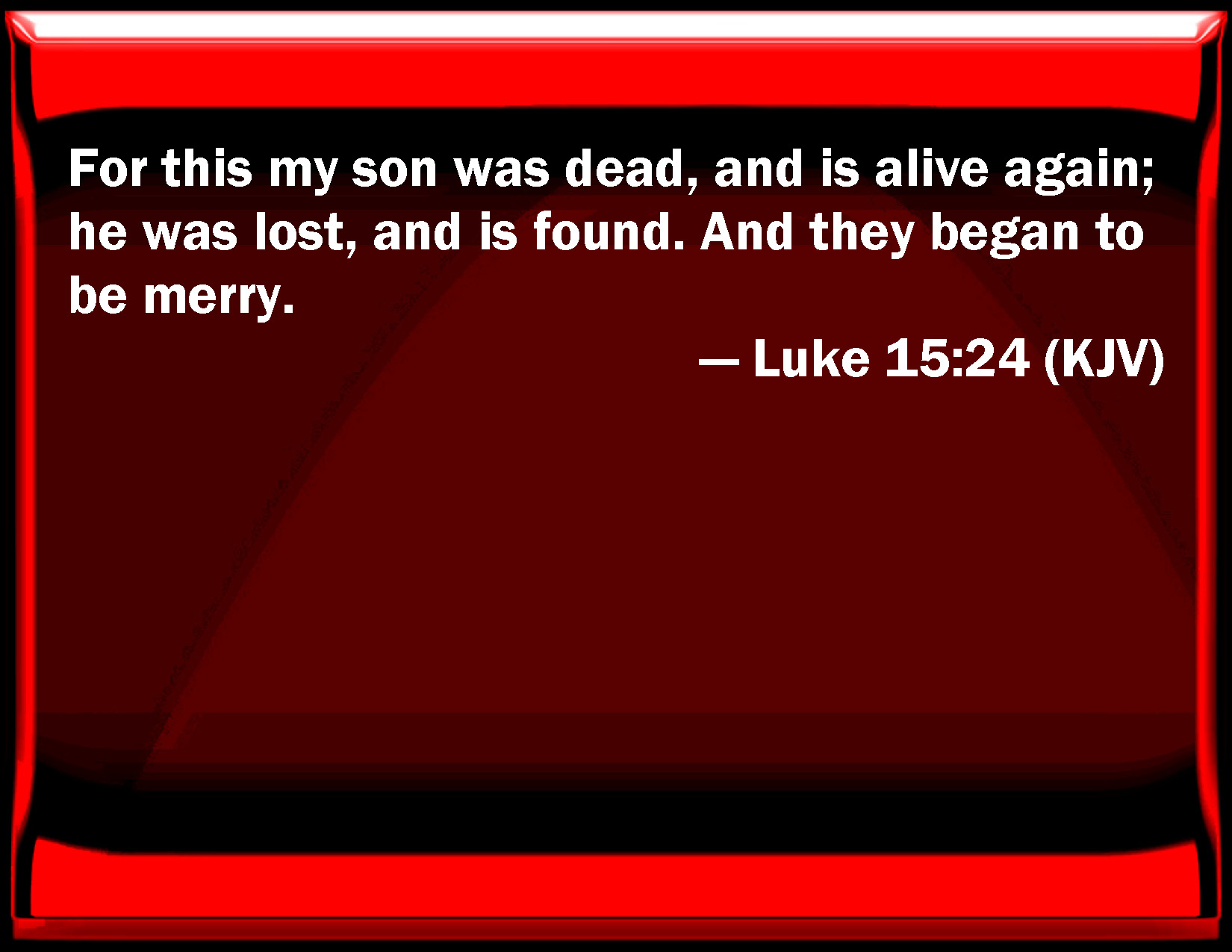 Bible Verse Slide Luke 15:24 For this my son was dead, and is alive again; he was lost, and is found. And they began to be merry. KJV: For this my son was dead, and is alive again; he was lost, and is found. And they began to be merry. DRB: Because this my son was dead, and is come to life again: was lost, and is found. And they began to be merry. DBT: for this my son was dead and has come to life, was lost and has been found. And they began to make merry. ERV: for this my son was dead, and is alive again; he was lost, and is found. And they began to be merry. WBT: For this my son was dead, and is alive again; he was lost, and is found. And they began to be merry. WEB: for this, my son, was dead, and is alive again. He was lost, and is found.' They began to celebrate. YLT: because this my son was dead, and did live again, and he was lost, and was found; and they began to be merry.Links Luke 15:24 NIV • Luke 15:24 NLT • Luke 15:24 ESV • Luke 15:24 NASB • Luke 15:24 KJV • Luke 15:24 Interlinear • Luke 15:24 Commentaries • Luke 15:24 Parallel Texts • Luke 15:24 Bible Apps • Luke 15:24 Parallel • Bible Hub |