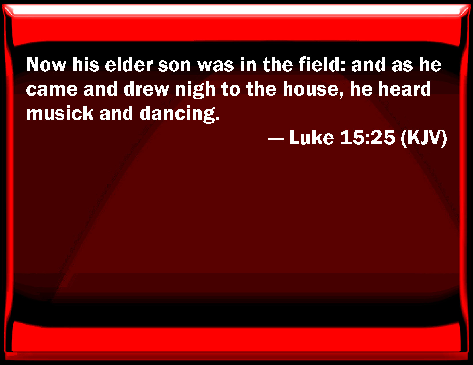 Bible Verse Slide Luke 15:25 Now his elder son was in the field: and as he came and drew near to the house, he heard music and dancing. KJV: Now his elder son was in the field: and as he came and drew nigh to the house, he heard musick and dancing. DRB: Now his elder son was in the field, and when he came and drew nigh to the house, he heard music and dancing: DBT: And his elder son was in the field; and as, coming up, he drew nigh to the house, he heard music and dancing. ERV: Now his elder son was in the field: and as he came and drew nigh to the house, he heard music and dancing. WBT: Now his elder son was in the field: and as he came and drew nigh to the house, he heard music and dancing. WEB: "Now his elder son was in the field. As he came near to the house, he heard music and dancing. YLT: 'And his elder son was in a field, and as, coming, he drew nigh to the house, he heard music and dancing,Links Luke 15:25 NIV • Luke 15:25 NLT • Luke 15:25 ESV • Luke 15:25 NASB • Luke 15:25 KJV • Luke 15:25 Interlinear • Luke 15:25 Commentaries • Luke 15:25 Parallel Texts • Luke 15:25 Bible Apps • Luke 15:25 Parallel • Bible Hub |
