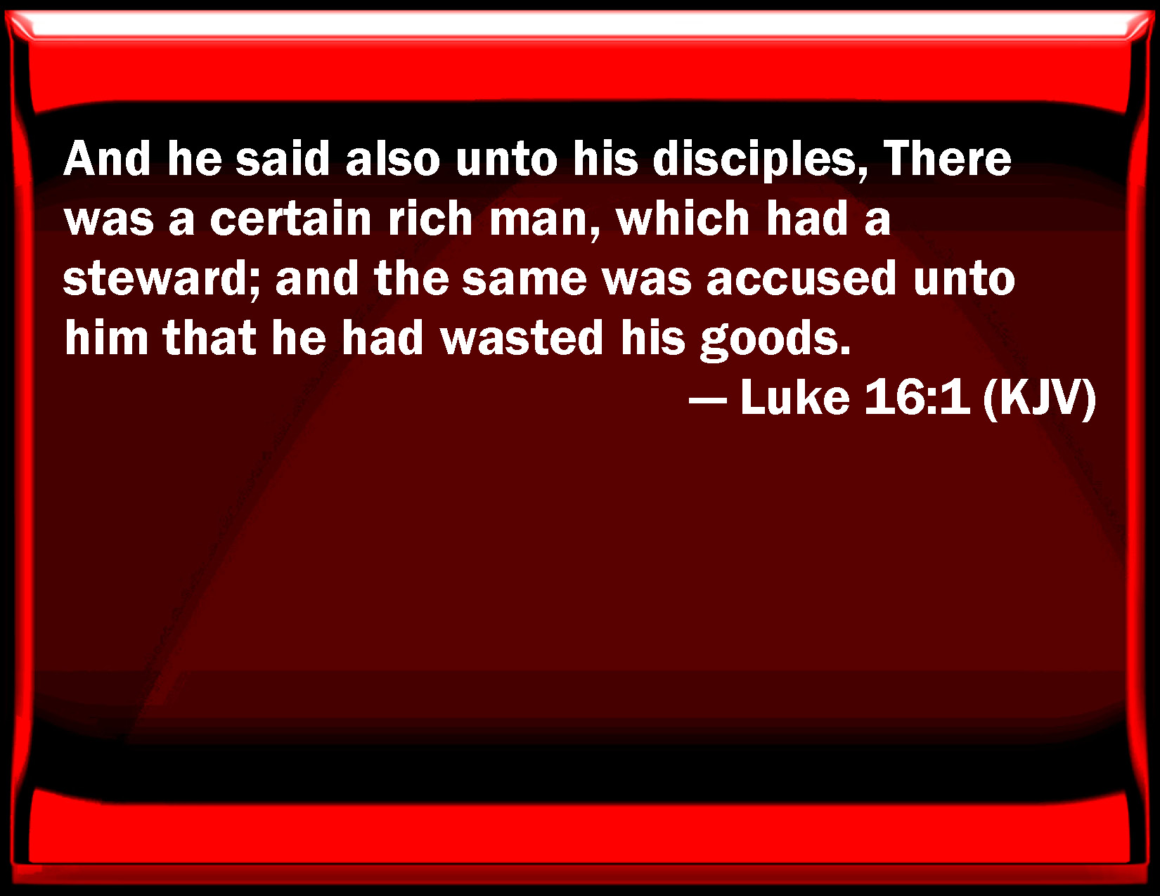 Bible Verse Slide Luke 16:1 And he said also to his disciples, There was a certain rich man, which had a steward; and the same was accused to him that he had wasted his goods. KJV: And he said also unto his disciples, There was a certain rich man, which had a steward; and the same was accused unto him that he had wasted his goods. DRB: AND he said also to his disciples: There was a certain rich man who had a steward: and the same was accused unto him, that he had wasted his goods. DBT: And he said also to his disciples, There was a certain rich man who had a steward, and he was accused to him as wasting his goods. ERV: And he said also unto the disciples, There was a certain rich man, which had a steward; and the same was accused unto him that he was wasting his goods. WBT: And he said also to his disciples, There was a certain rich man who had a steward; and the same was accused to him that he had wasted his goods. WEB: He also said to his disciples, "There was a certain rich man who had a manager. An accusation was made to him that this man was wasting his possessions. YLT: And he said also unto his disciples, 'A certain man was rich, who had a steward, and he was accused to him as scattering his goods;Links Luke 16:1 NIV • Luke 16:1 NLT • Luke 16:1 ESV • Luke 16:1 NASB • Luke 16:1 KJV • Luke 16:1 Interlinear • Luke 16:1 Commentaries • Luke 16:1 Parallel Texts • Luke 16:1 Bible Apps • Luke 16:1 Parallel • Bible Hub |