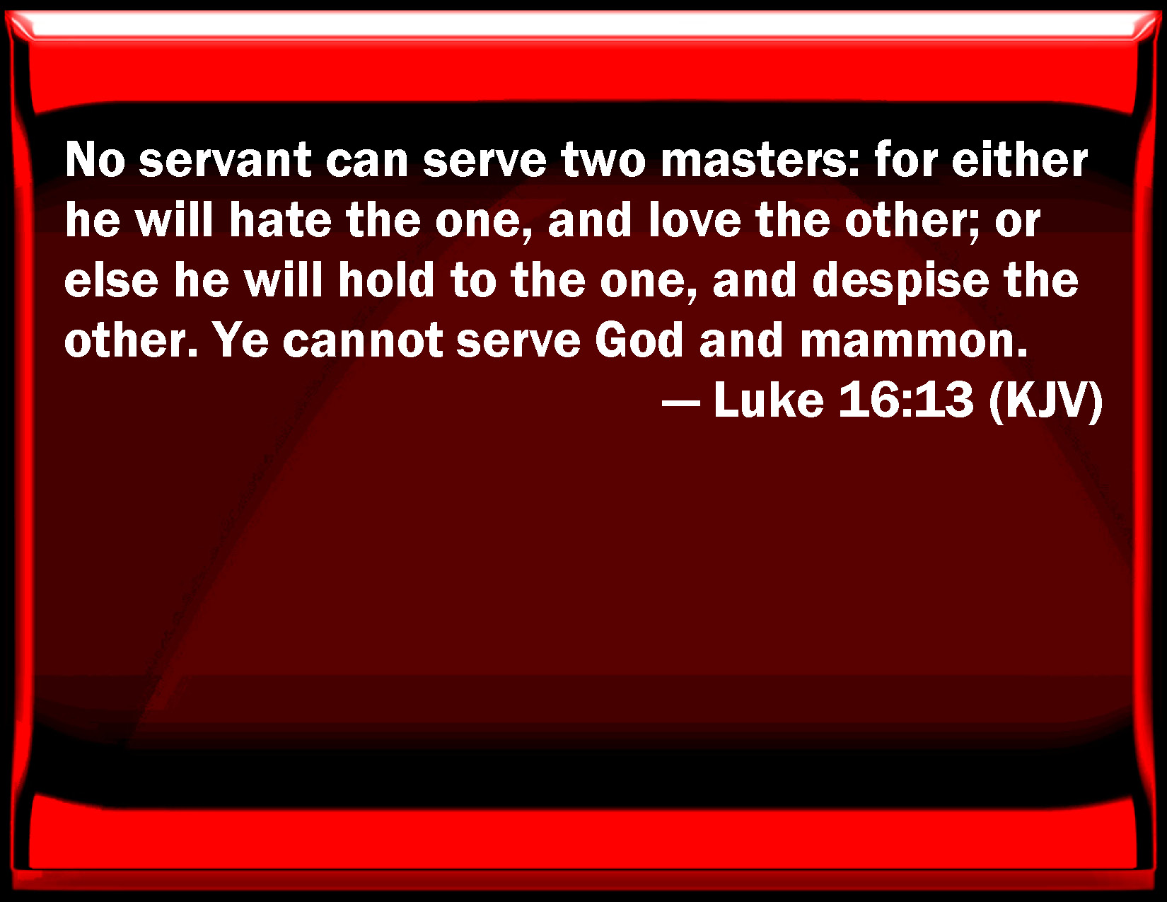Bible Verse Slide Luke 16:13 No servant can serve two masters: for either he will hate the one, and love the other; or else he will hold to the one, and despise the other. You cannot serve God and mammon. KJV: No servant can serve two masters: for either he will hate the one, and love the other; or else he will hold to the one, and despise the other. Ye cannot serve God and mammon. DRB: No servant can serve two masters: for either he will hate the one, and love the other; or he will hold to the one, and despise the other. You cannot serve God and mammon. DBT: No servant can serve two masters, for either he will hate the one and will love the other, or he will cleave to the one and despise the other. Ye cannot serve God and mammon. ERV: No servant can serve two masters: for either he will hate the one, and love the other; or else he will hold to one, and despise the other. Ye cannot serve God and mammon. WBT: No servant can serve two masters: for either he will hate the one, and love the other; or else he will hold to the one, and despise the other. Ye cannot serve God and mammon. WEB: No servant can serve two masters, for either he will hate the one, and love the other; or else he will hold to one, and despise the other. You aren't able to serve God and mammon." YLT: 'No domestic is able to serve two lords, for either the one he will hate, and the other he will love; or one he will hold to, and of the other he will be heedless; ye are not able to serve God and mammon.'Links Luke 16:13 NIV • Luke 16:13 NLT • Luke 16:13 ESV • Luke 16:13 NASB • Luke 16:13 KJV • Luke 16:13 Interlinear • Luke 16:13 Commentaries • Luke 16:13 Parallel Texts • Luke 16:13 Bible Apps • Luke 16:13 Parallel • Bible Hub |
