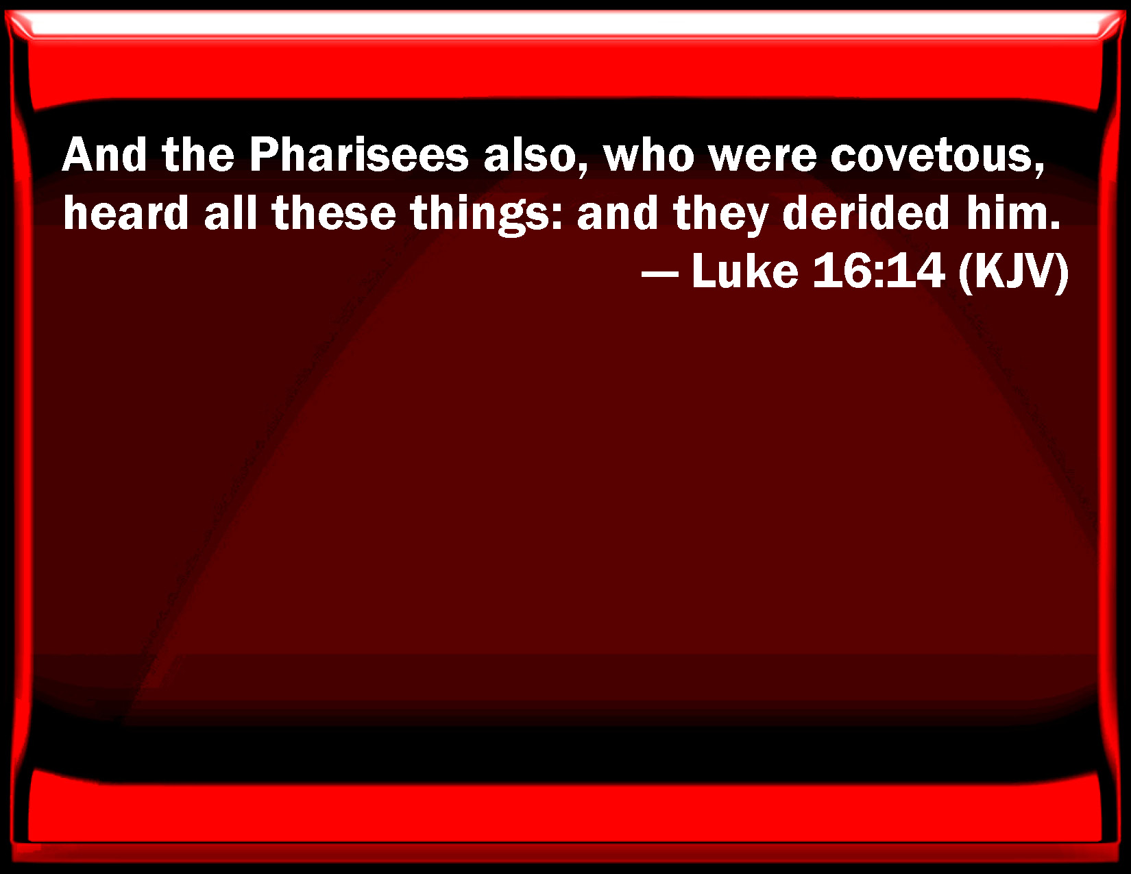 Bible Verse Slide Luke 16:14 And the Pharisees also, who were covetous, heard all these things: and they derided him. KJV: And the Pharisees also, who were covetous, heard all these things: and they derided him. DRB: Now the Pharisees, who were covetous, heard all these things: and they derided him. DBT: And the Pharisees also, who were covetous, heard all these things, and mocked him. ERV: And the Pharisees, who were lovers of money, heard all these things; and they scoffed at him. WBT: And the Pharisees also, who were covetous, heard all these things, and they derided him. WEB: The Pharisees, who were lovers of money, also heard all these things, and they scoffed at him. YLT: And also the Pharisees, being lovers of money, were hearing all these things, and were deriding him,Links Luke 16:14 NIV • Luke 16:14 NLT • Luke 16:14 ESV • Luke 16:14 NASB • Luke 16:14 KJV • Luke 16:14 Interlinear • Luke 16:14 Commentaries • Luke 16:14 Parallel Texts • Luke 16:14 Bible Apps • Luke 16:14 Parallel • Bible Hub |