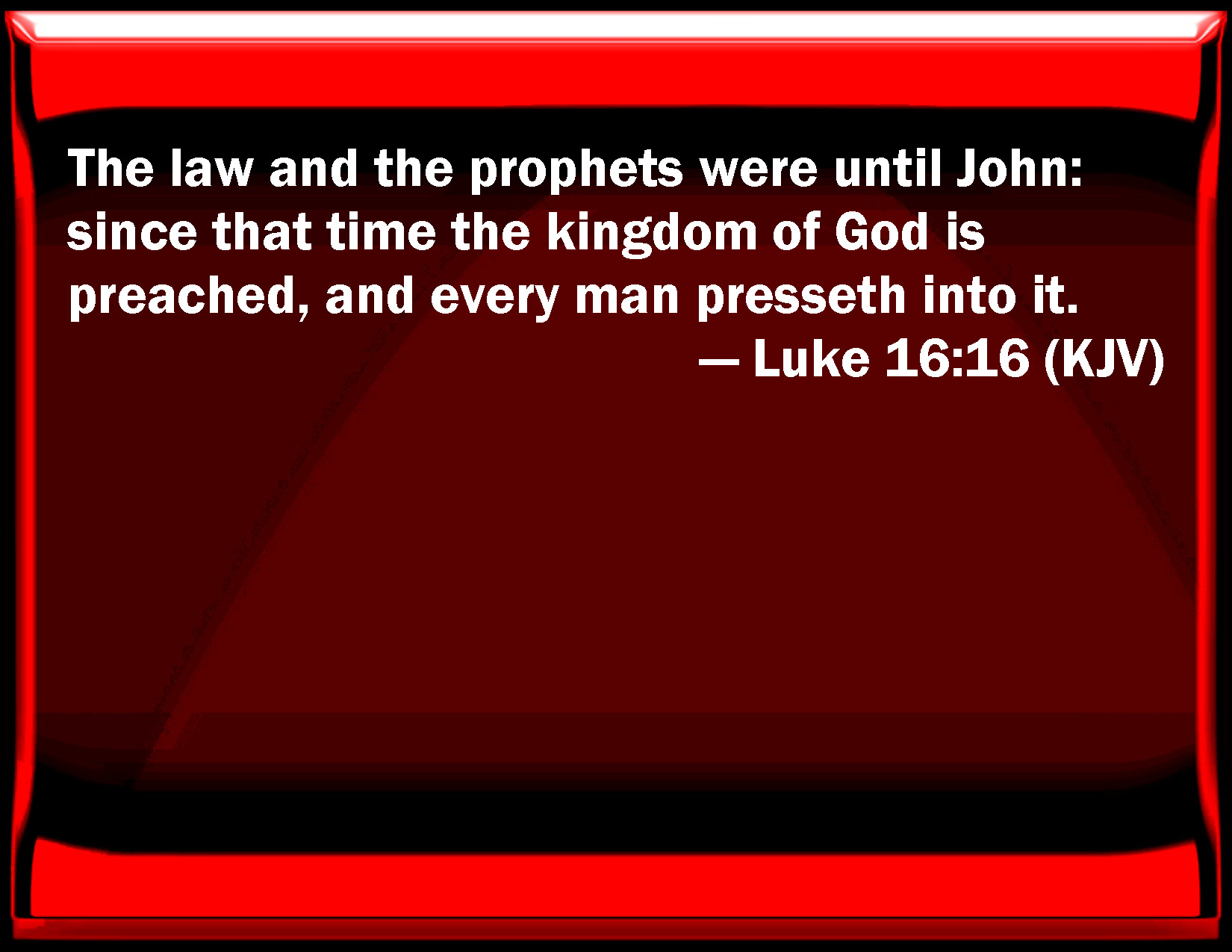 Luke 16:16 The law and the prophets were until John: since that time the kingdom of God is preached, and every man presses into it.