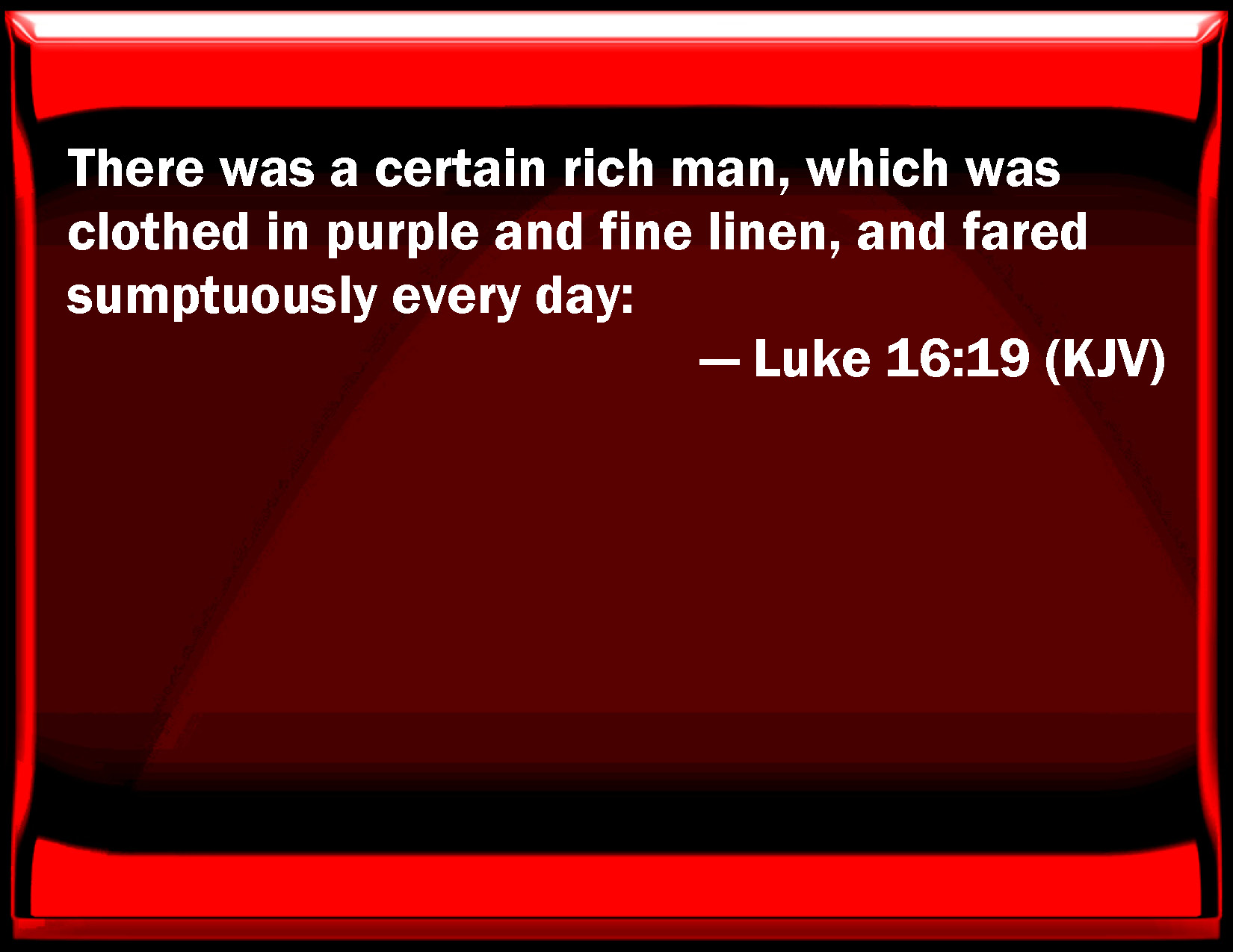 Bible Verse Slide Luke 16:19 There was a certain rich man, which was clothed in purple and fine linen, and fared sumptuously every day: KJV: There was a certain rich man, which was clothed in purple and fine linen, and fared sumptuously every day: DRB: There was a certain rich man, who was clothed in purple and fine linen; and feasted sumptuously every day. DBT: Now there was a rich man and he was clothed in purple and fine linen, making good cheer in splendour every day. ERV: Now there was a certain rich man, and he was clothed in purple and fine linen, faring sumptuously every day: WBT: There was a certain rich man, who was clothed in purple and fine linen, and fared sumptuously every day: WEB: "Now there was a certain rich man, and he was clothed in purple and fine linen, living in luxury every day. YLT: And — a certain man was rich, and was clothed in purple and fine linen, making merry sumptuously every day,Links Luke 16:19 NIV • Luke 16:19 NLT • Luke 16:19 ESV • Luke 16:19 NASB • Luke 16:19 KJV • Luke 16:19 Interlinear • Luke 16:19 Commentaries • Luke 16:19 Parallel Texts • Luke 16:19 Bible Apps • Luke 16:19 Parallel • Bible Hub |