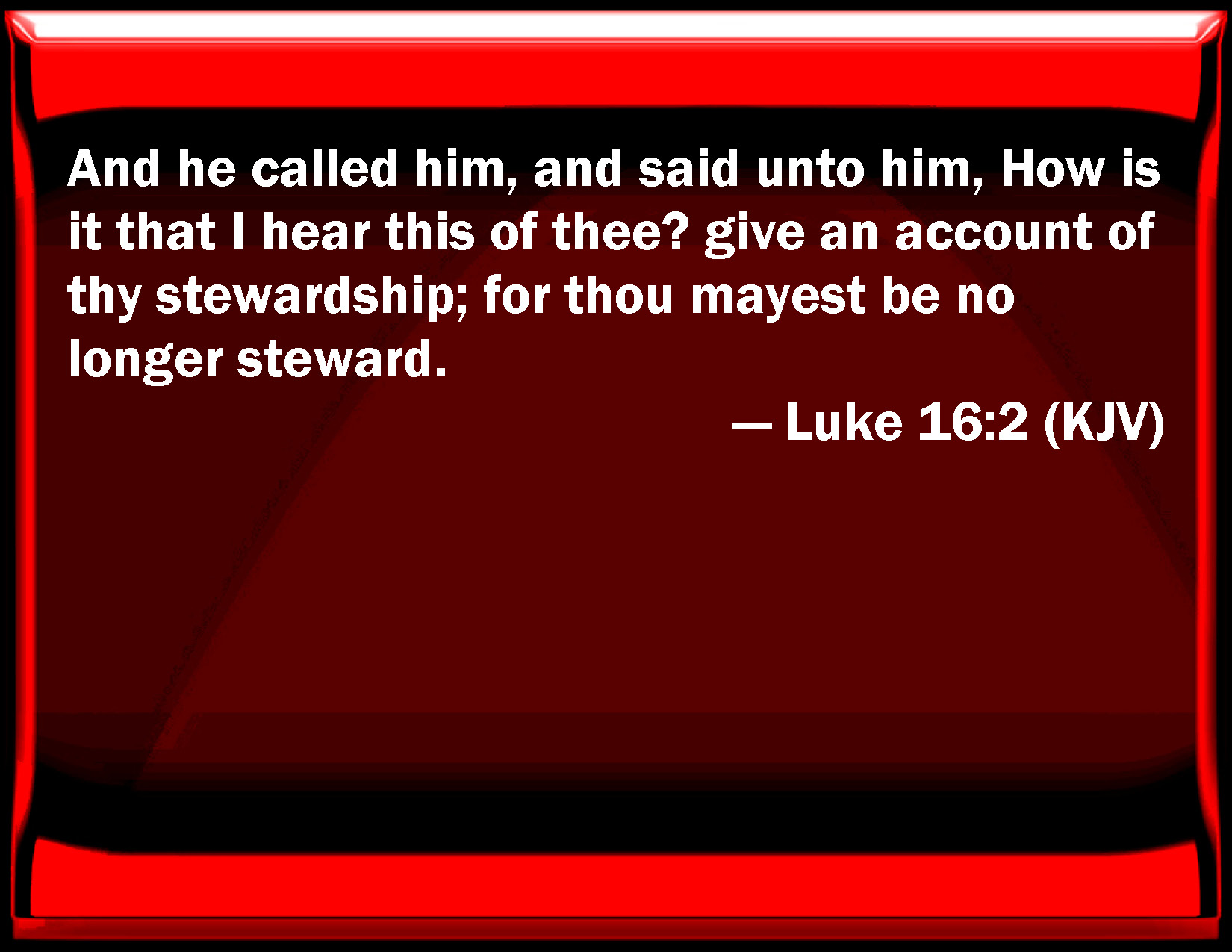 Bible Verse Slide Luke 16:2 And he called him, and said to him, How is it that I hear this of you? give an account of your stewardship; for you may be no longer steward. KJV: And he called him, and said unto him, How is it that I hear this of thee? give an account of thy stewardship; for thou mayest be no longer steward. DRB: And he called him, and said to him: How is it that I hear this of thee? give an account of thy stewardship: for now thou canst be steward no longer. DBT: And having called him, he said to him, What is this that I hear of thee? give the reckoning of thy stewardship, for thou canst be no longer steward. ERV: And he called him, and said unto him, What is this that I hear of thee? render the account of thy stewardship; for thou canst be no longer steward. WBT: And he called him, and said to him, How is it that I hear this of thee? give an account of thy stewardship: for thou mayest be no longer steward. WEB: He called him, and said to him, 'What is this that I hear about you? Give an accounting of your management, for you can no longer be manager.' YLT: and having called him, he said to him, What is this I hear about thee? render the account of thy stewardship, for thou mayest not any longer be steward.Links Luke 16:2 NIV • Luke 16:2 NLT • Luke 16:2 ESV • Luke 16:2 NASB • Luke 16:2 KJV • Luke 16:2 Interlinear • Luke 16:2 Commentaries • Luke 16:2 Parallel Texts • Luke 16:2 Bible Apps • Luke 16:2 Parallel • Bible Hub |