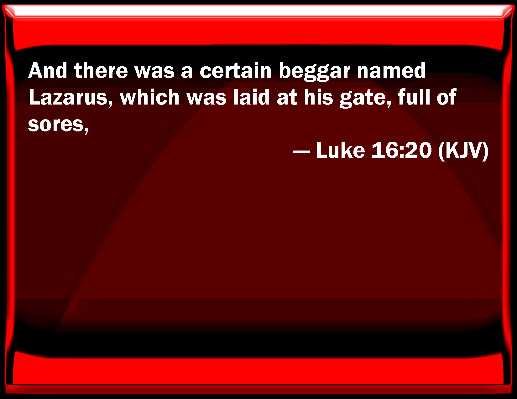 Bible Verse Slide Luke 16:20 And there was a certain beggar named Lazarus, which was laid at his gate, full of sores, KJV: And there was a certain beggar named Lazarus, which was laid at his gate, full of sores, DRB: And there was a certain beggar, named Lazarus, who lay at his gate, full of sores, DBT: And there was a poor man, by name Lazarus, who was laid at his gateway full of sores, ERV: and a certain beggar named Lazarus was laid at his gate, full of sores, WBT: And there was a certain beggar named Lazarus, who was laid at his gate, full of sores, WEB: A certain beggar, named Lazarus, was laid at his gate, full of sores, YLT: and there was a certain poor man, by name Lazarus, who was laid at his porch, full of sores,Links Luke 16:20 NIV • Luke 16:20 NLT • Luke 16:20 ESV • Luke 16:20 NASB • Luke 16:20 KJV • Luke 16:20 Interlinear • Luke 16:20 Commentaries • Luke 16:20 Parallel Texts • Luke 16:20 Bible Apps • Luke 16:20 Parallel • Bible Hub |