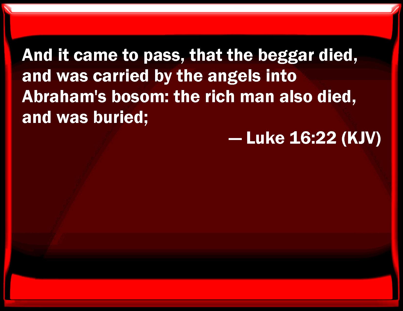 Bible Verse Slide Luke 16:22 And it came to pass, that the beggar died, and was carried by the angels into Abraham's bosom: the rich man also died, and was buried; KJV: And it came to pass, that the beggar died, and was carried by the angels into Abraham's bosom: the rich man also died, and was buried; DRB: And it came to pass, that the beggar died, and was carried by the angels into Abraham's bosom. And the rich man also died: and he was buried in hell. DBT: And it came to pass that the poor man died, and that he was carried away by the angels into the bosom of Abraham. And the rich man also died and was buried. ERV: And it came to pass, that the beggar died, and that he was carried away by the angels into Abraham's bosom: and the rich man also died, and was buried. WBT: And it came to pass, that the beggar died, and was carried by angels into Abraham's bosom. The rich man also died, and was buried: WEB: It happened that the beggar died, and that he was carried away by the angels to Abraham's bosom. The rich man also died, and was buried. YLT: And it came to pass, that the poor man died, and that he was carried away by the messengers to the bosom of Abraham — and the rich man also died, and was buried;Links Luke 16:22 NIV • Luke 16:22 NLT • Luke 16:22 ESV • Luke 16:22 NASB • Luke 16:22 KJV • Luke 16:22 Interlinear • Luke 16:22 Commentaries • Luke 16:22 Parallel Texts • Luke 16:22 Bible Apps • Luke 16:22 Parallel • Bible Hub |