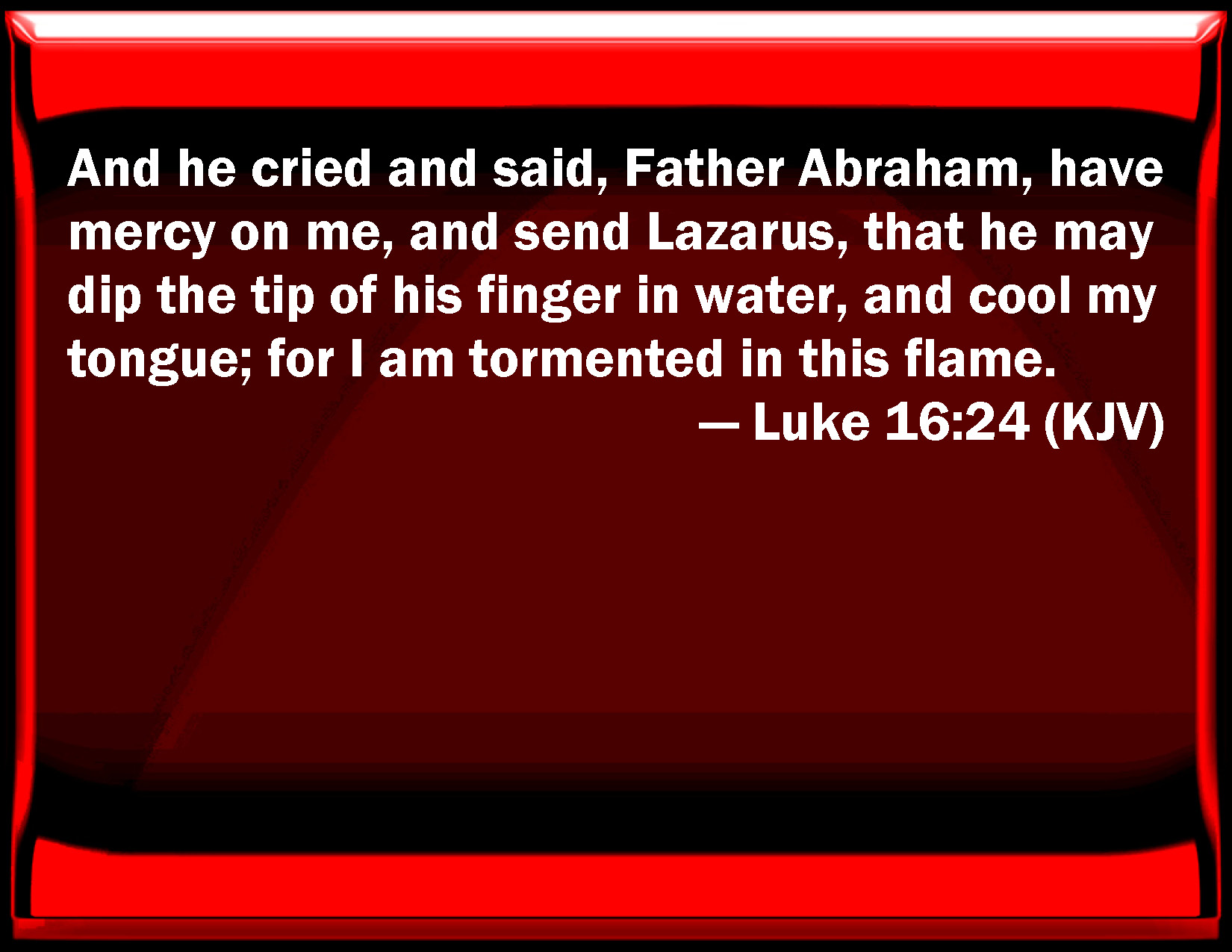 Bible Verse Slide Luke 16:24 And he cried and said, Father Abraham, have mercy on me, and send Lazarus, that he may dip the tip of his finger in water, and cool my tongue; for I am tormented in this flame. KJV: And he cried and said, Father Abraham, have mercy on me, and send Lazarus, that he may dip the tip of his finger in water, and cool my tongue; for I am tormented in this flame. DRB: And he cried, and said: Father Abraham, have mercy on me, and send Lazarus, that he may dip the tip of his finger in water, to cool my tongue: for I am tormented in this flame. DBT: And he crying out said, Father Abraham, have compassion on me, and send Lazarus that he may dip the tip of his finger in water and cool my tongue, for I am suffering in this flame. ERV: And he cried and said, Father Abraham, have mercy on me, and send Lazarus, that he may dip the tip of his finger in water, and cool my tongue; for I am in anguish in this flame. WBT: And he cried, and said, Father Abraham, have mercy on me, and send Lazarus, that he may dip the tip of his finger in water, and cool my tongue: for I am tormented in this flame. WEB: He cried and said, 'Father Abraham, have mercy on me, and send Lazarus, that he may dip the tip of his finger in water, and cool my tongue! For I am in anguish in this flame.' YLT: and having cried, he said, Father Abraham, deal kindly with me, and send Lazarus, that he may dip the tip of his finger in water, and may cool my tongue, because I am distressed in this flame.Links Luke 16:24 NIV • Luke 16:24 NLT • Luke 16:24 ESV • Luke 16:24 NASB • Luke 16:24 KJV • Luke 16:24 Interlinear • Luke 16:24 Commentaries • Luke 16:24 Parallel Texts • Luke 16:24 Bible Apps • Luke 16:24 Parallel • Bible Hub |
