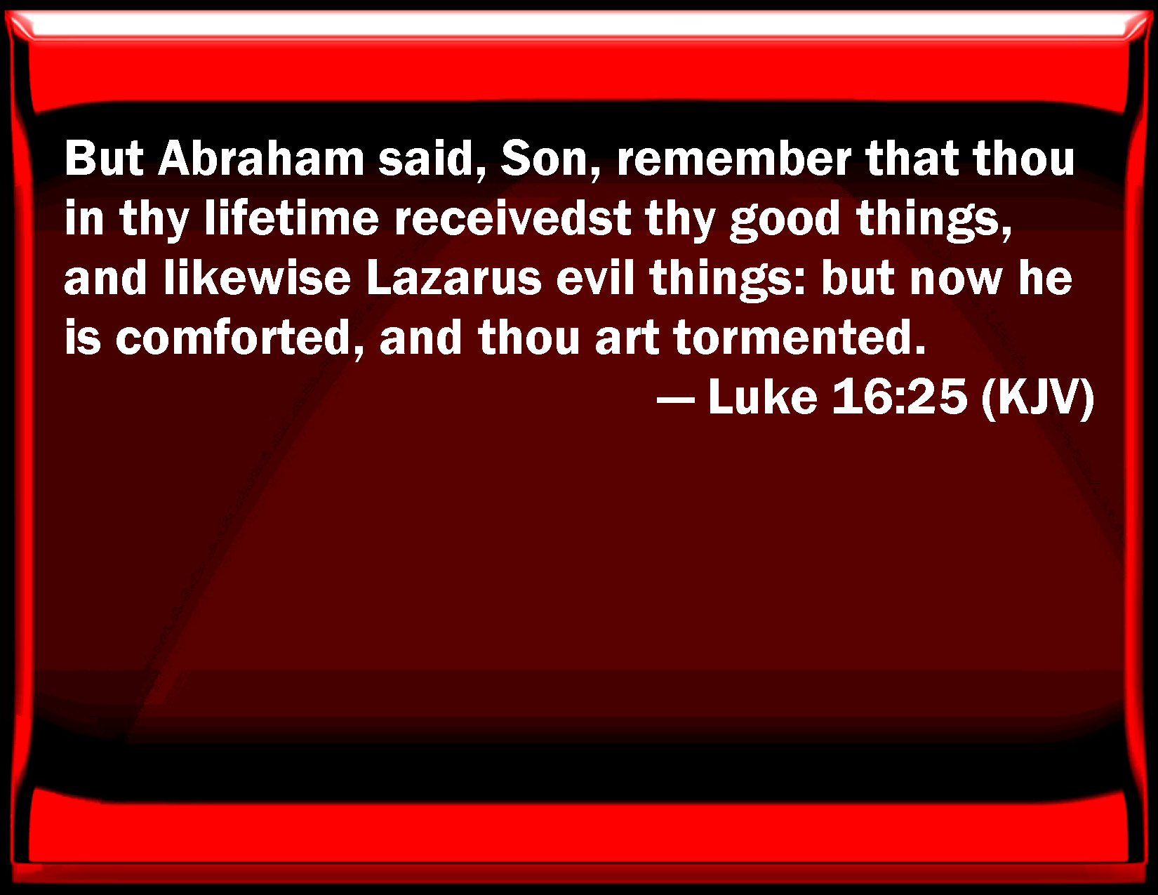 Bible Verse Slide Luke 16:25 But Abraham said, Son, remember that you in your lifetime received your good things, and likewise Lazarus evil things: but now he is comforted, and you are tormented. KJV: But Abraham said, Son, remember that thou in thy lifetime receivedst thy good things, and likewise Lazarus evil things: but now he is comforted, and thou art tormented. DRB: And Abraham said to him: Son, remember that thou didst receive good things in thy lifetime, and likewise Lazareth evil things, but now he is comforted; and thou art tormented. DBT: But Abraham said, Child, recollect that thou hast fully received thy good things in thy lifetime, and likewise Lazarus evil things. But now he is comforted here, and thou art in suffering. ERV: But Abraham said, Son, remember that thou in thy lifetime receivedst thy good things, and Lazarus in like manner evil things: but now here he is comforted, and thou art in anguish. WBT: But Abraham said, Son, remember that thou in thy life-time receivedst thy good things, and likewise Lazarus evil things: but now he is comforted, and thou art tormented. WEB: "But Abraham said, 'Son, remember that you, in your lifetime, received your good things, and Lazarus, in the same way, bad things. But now here he is comforted and you are in anguish. YLT: And Abraham said, Child, remember that thou did receive — thou — thy good things in thy life, and Lazarus in like manner the evil things, and now he is comforted, and thou art distressed;Links Luke 16:25 NIV • Luke 16:25 NLT • Luke 16:25 ESV • Luke 16:25 NASB • Luke 16:25 KJV • Luke 16:25 Interlinear • Luke 16:25 Commentaries • Luke 16:25 Parallel Texts • Luke 16:25 Bible Apps • Luke 16:25 Parallel • Bible Hub |