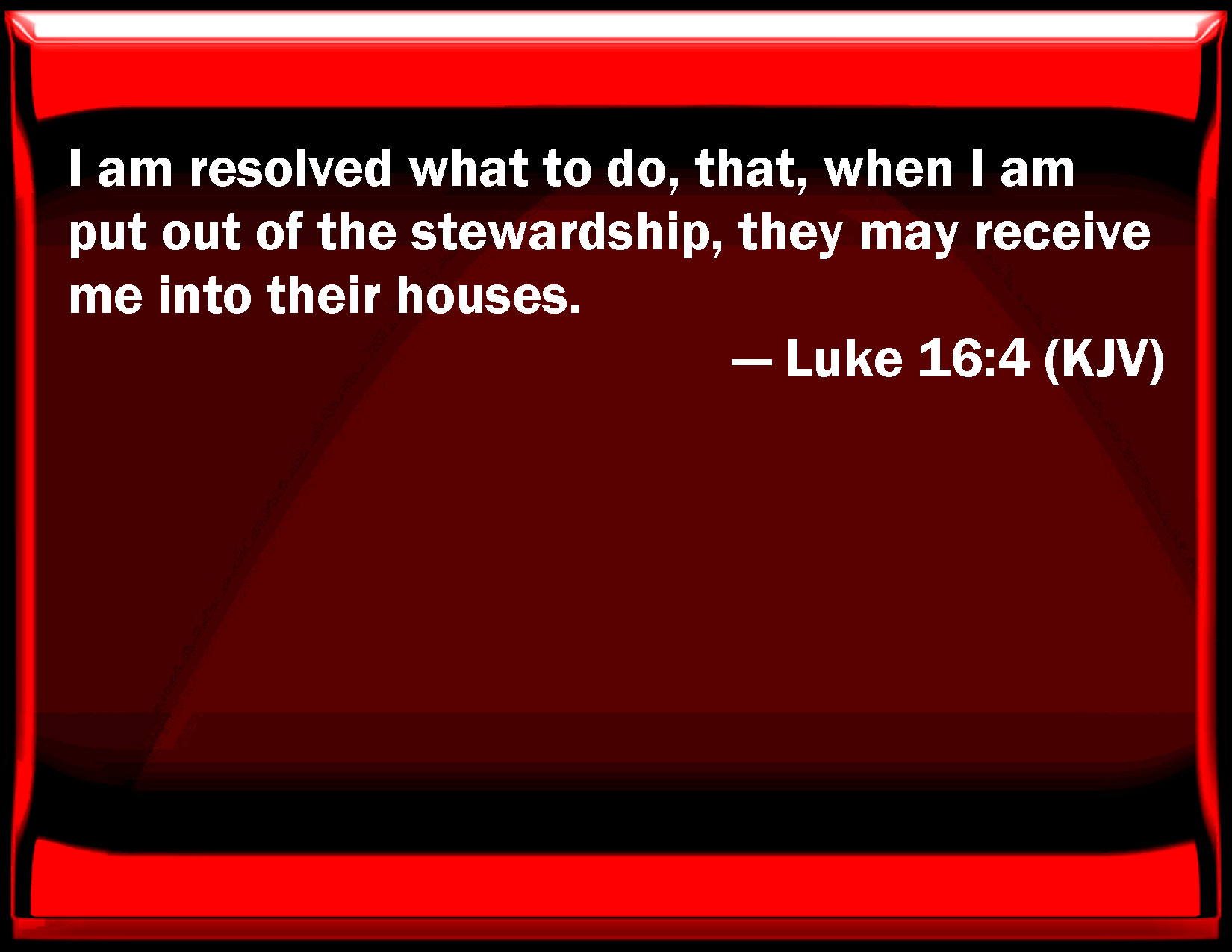 Bible Verse Slide Luke 16:4 I am resolved what to do, that, when I am put out of the stewardship, they may receive me into their houses. KJV: I am resolved what to do, that, when I am put out of the stewardship, they may receive me into their houses. DRB: I know what I will do, that when I shall be removed from the stewardship, they may receive me into their houses. DBT: I know what I will do, that when I shall have been removed from the stewardship I may be received into their houses. ERV: I am resolved what to do, that, when I am put out of the stewardship, they may receive me into their houses. WBT: I am resolved what to do, that when I am removed from the stewardship, they may receive me into their houses. WEB: I know what I will do, so that when I am removed from management, they may receive me into their houses.' YLT: I have known what I shall do, that, when I may be removed from the stewardship, they may receive me to their houses.Links Luke 16:4 NIV • Luke 16:4 NLT • Luke 16:4 ESV • Luke 16:4 NASB • Luke 16:4 KJV • Luke 16:4 Interlinear • Luke 16:4 Commentaries • Luke 16:4 Parallel Texts • Luke 16:4 Bible Apps • Luke 16:4 Parallel • Bible Hub |