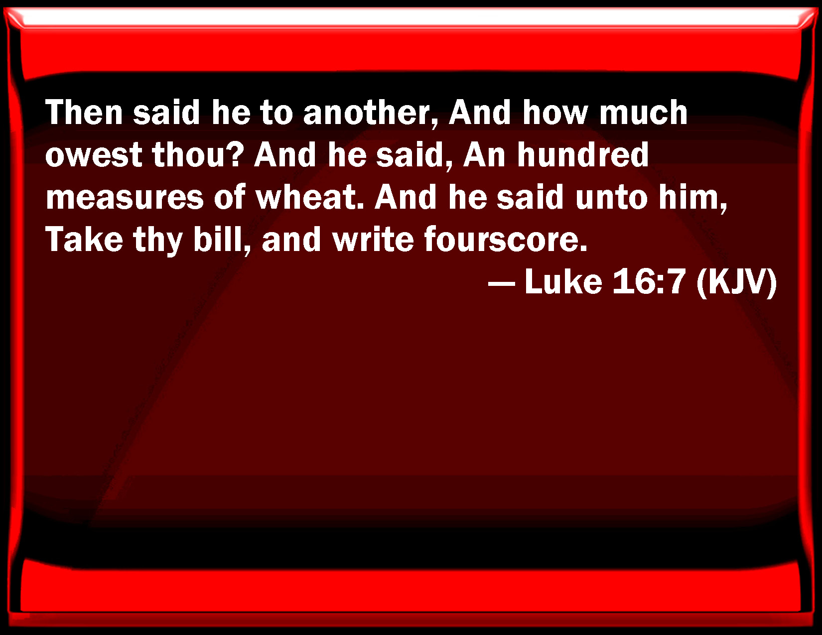 Bible Verse Slide Luke 16:7 Then said he to another, And how much owe you? And he said, An hundred measures of wheat. And he said to him, Take your bill, and write fourscore. KJV: Then said he to another, And how much owest thou? And he said, An hundred measures of wheat. And he said unto him, Take thy bill, and write fourscore. DRB: Then he said to another: And how much dost thou owe? Who said: An hundred quarters of wheat. He said to him: Take thy bill, and write eighty. DBT: Then he said to another, And thou, how much dost thou owe? And he said, A hundred cors of wheat. And he says to him, Take thy writing and write eighty. ERV: Then said he to another, And how much owest thou? And he said, A hundred measures of wheat. He saith unto him, Take thy bond, and write fourscore. WBT: Then said he to another, And how much owest thou? And he said, A hundred measures of wheat. And he said to him, Take thy bill, and write eighty. WEB: Then he said to another, 'How much do you owe?' He said, 'A hundred cors of wheat.' He said to him, 'Take your bill, and write eighty.' YLT: 'Afterward to another he said, And thou, how much dost thou owe? and he said, A hundred cors of wheat; and he saith to him, Take thy bill, and write eighty.Links Luke 16:7 NIV • Luke 16:7 NLT • Luke 16:7 ESV • Luke 16:7 NASB • Luke 16:7 KJV • Luke 16:7 Interlinear • Luke 16:7 Commentaries • Luke 16:7 Parallel Texts • Luke 16:7 Bible Apps • Luke 16:7 Parallel • Bible Hub |