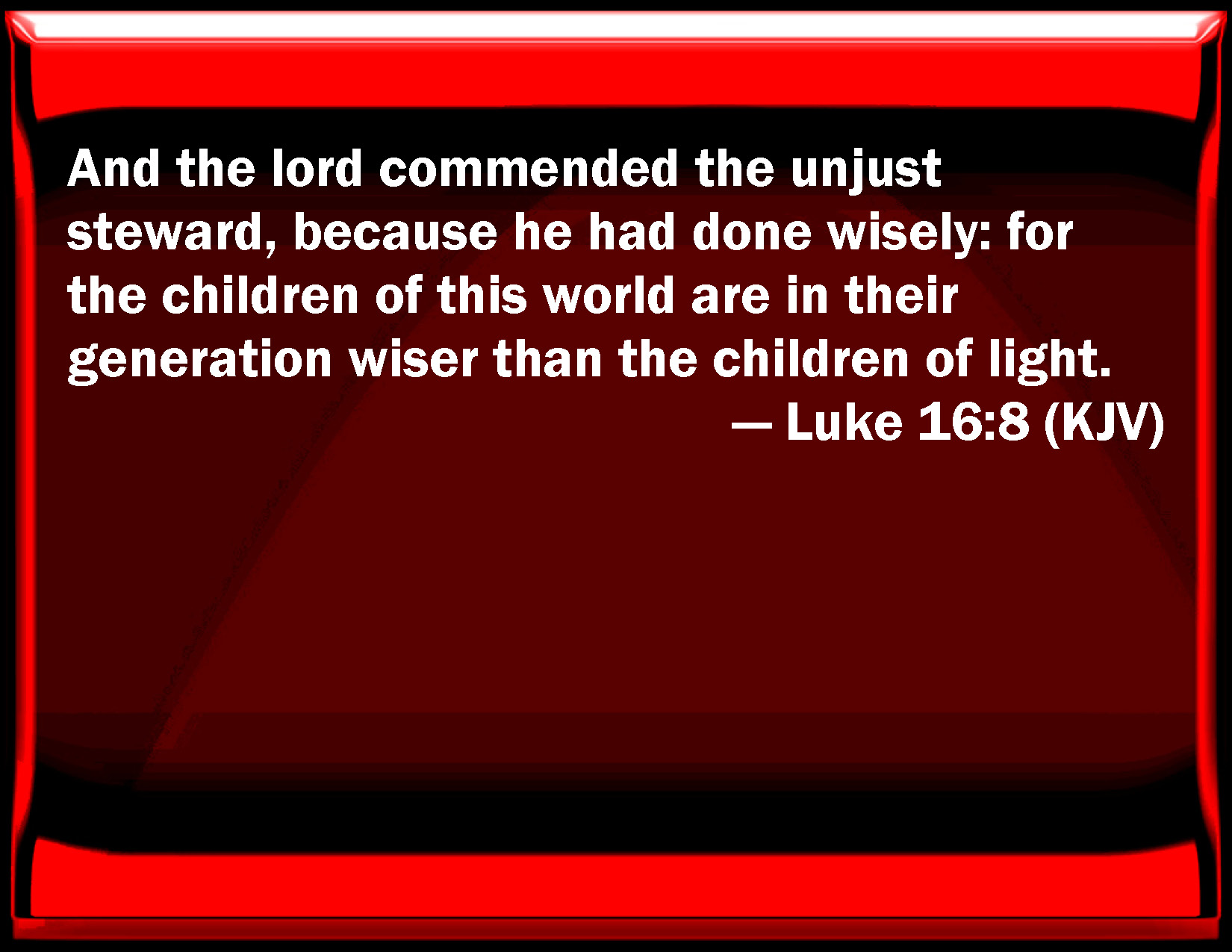 Bible Verse Slide Luke 16:8 And the lord commended the unjust steward, because he had done wisely: for the children of this world are in their generation wiser than the children of light. KJV: And the lord commended the unjust steward, because he had done wisely: for the children of this world are in their generation wiser than the children of light. DRB: And the lord commended the unjust steward, forasmuch as he had done wisely: for the children of this world are wiser in their generation than the children of light. DBT: And the lord praised the unrighteous steward because he had done prudently. For the sons of this world are, for their own generation, more prudent than the sons of light. ERV: And his lord commended the unrighteous steward because he had done wisely: for the sons of this world are for their own generation wiser than the sons of the light. WBT: And the lord commended the unjust steward, because he had done wisely: for the children of this world are in their generation wiser than the children of light. WEB: "His lord commended the dishonest manager because he had done wisely, for the children of this world are, in their own generation, wiser than the children of the light. YLT: 'And the lord commended the unrighteous steward that he did prudently, because the sons of this age are more prudent than the sons of the light, in respect to their generation.Links Luke 16:8 NIV • Luke 16:8 NLT • Luke 16:8 ESV • Luke 16:8 NASB • Luke 16:8 KJV • Luke 16:8 Interlinear • Luke 16:8 Commentaries • Luke 16:8 Parallel Texts • Luke 16:8 Bible Apps • Luke 16:8 Parallel • Bible Hub |