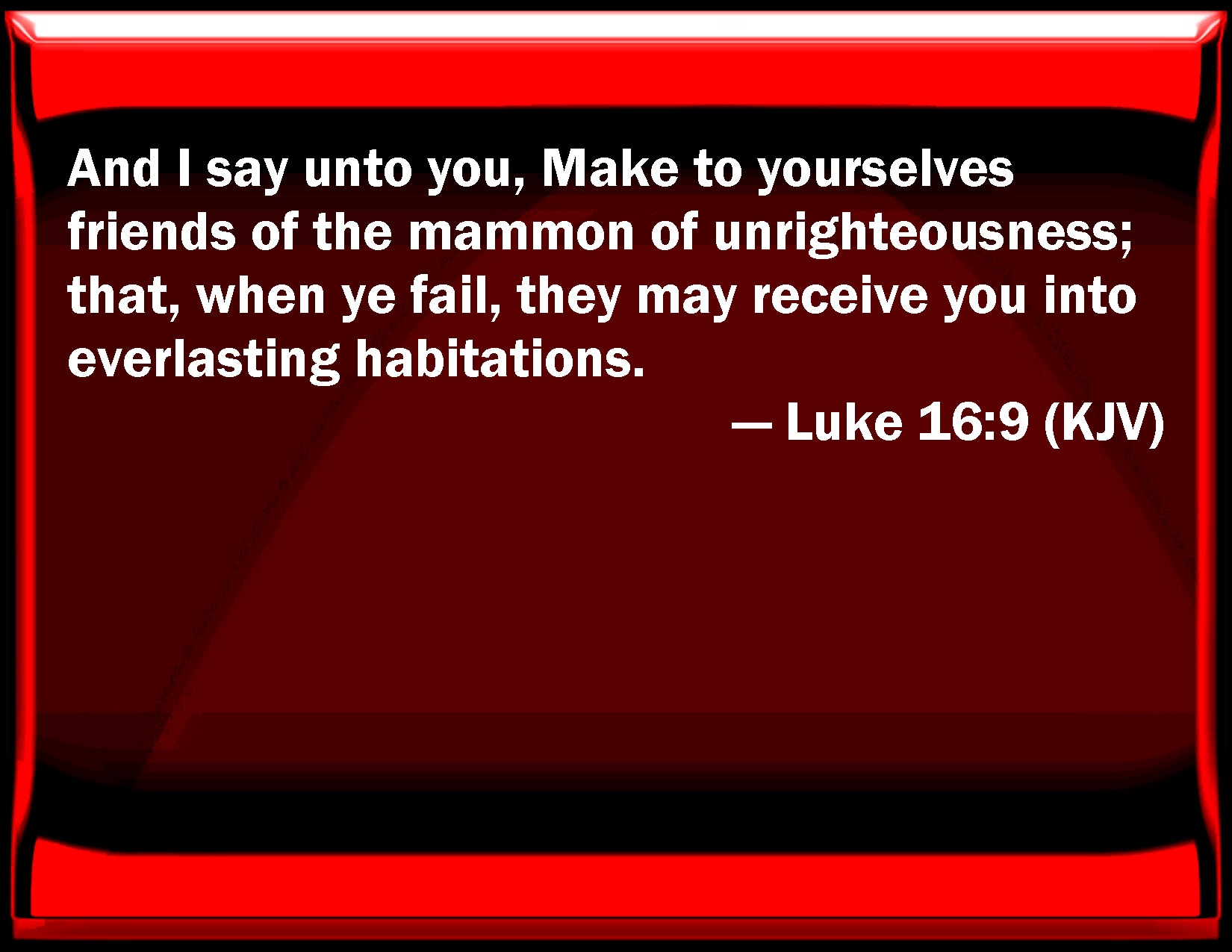 Bible Verse Slide Luke 16:9 And I say to you, Make to yourselves friends of the mammon of unrighteousness; that, when you fail, they may receive you into everlasting habitations. KJV: And I say unto you, Make to yourselves friends of the mammon of unrighteousness; that, when ye fail, they may receive you into everlasting habitations. DRB: And I say to you: Make unto you friends of the mammon of iniquity; that when you shall fail, they may receive you into everlasting dwellings. DBT: And I say to you, Make to yourselves friends with the mammon of unrighteousness, that when it fails ye may be received into the eternal tabernacles. ERV: And I say unto you, Make to yourselves friends by means of the mammon of unrighteousness; that, when it shall fail, they may receive you into the eternal tabernacles. WBT: And I say to you, Make to yourselves friends of the mammon of unrighteousness; that when ye fail, they may receive you into everlasting habitations. WEB: I tell you, make for yourselves friends by means of unrighteous mammon, so that when you fail, they may receive you into the eternal tents. YLT: and I say to you, Make to yourselves friends out of the mammon of unrighteousness, that when ye may fail, they may receive you to the age-during tabernacles.Links Luke 16:9 NIV • Luke 16:9 NLT • Luke 16:9 ESV • Luke 16:9 NASB • Luke 16:9 KJV • Luke 16:9 Interlinear • Luke 16:9 Commentaries • Luke 16:9 Parallel Texts • Luke 16:9 Bible Apps • Luke 16:9 Parallel • Bible Hub |