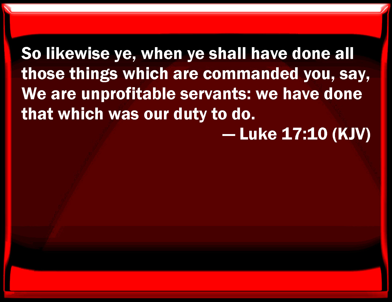 Bible Verse Slide Luke 17:10 So likewise you, when you shall have done all those things which are commanded you, say, We are unprofitable servants: we have done that which was our duty to do. KJV: So likewise ye, when ye shall have done all those things which are commanded you, say, We are unprofitable servants: we have done that which was our duty to do. DRB: I think not. So you also, when you shall have done all these things that are commanded you, say: We are unprofitable servants; we have done that which we ought to do. DBT: Thus ye also, when ye shall have done all things that have been ordered you, say, We are unprofitable bondmen; we have done what it was our duty to do. ERV: Even so ye also, when ye shall have done all the things that are commanded you, say, We are unprofitable servants; we have done that which it was our duty to do. WBT: So likewise ye, when ye shall have done all the things which are commanded you, say, We are unprofitable servants: we have done that which it was our duty to do. WEB: Even so you also, when you have done all the things that are commanded you, say, 'We are unworthy servants. We have done our duty.'" YLT: So also ye, when ye may have done all the things directed you, say — We are unprofitable servants, because that which we owed to do — we have done.'Links Luke 17:10 NIV • Luke 17:10 NLT • Luke 17:10 ESV • Luke 17:10 NASB • Luke 17:10 KJV • Luke 17:10 Interlinear • Luke 17:10 Commentaries • Luke 17:10 Parallel Texts • Luke 17:10 Bible Apps • Luke 17:10 Parallel • Bible Hub |