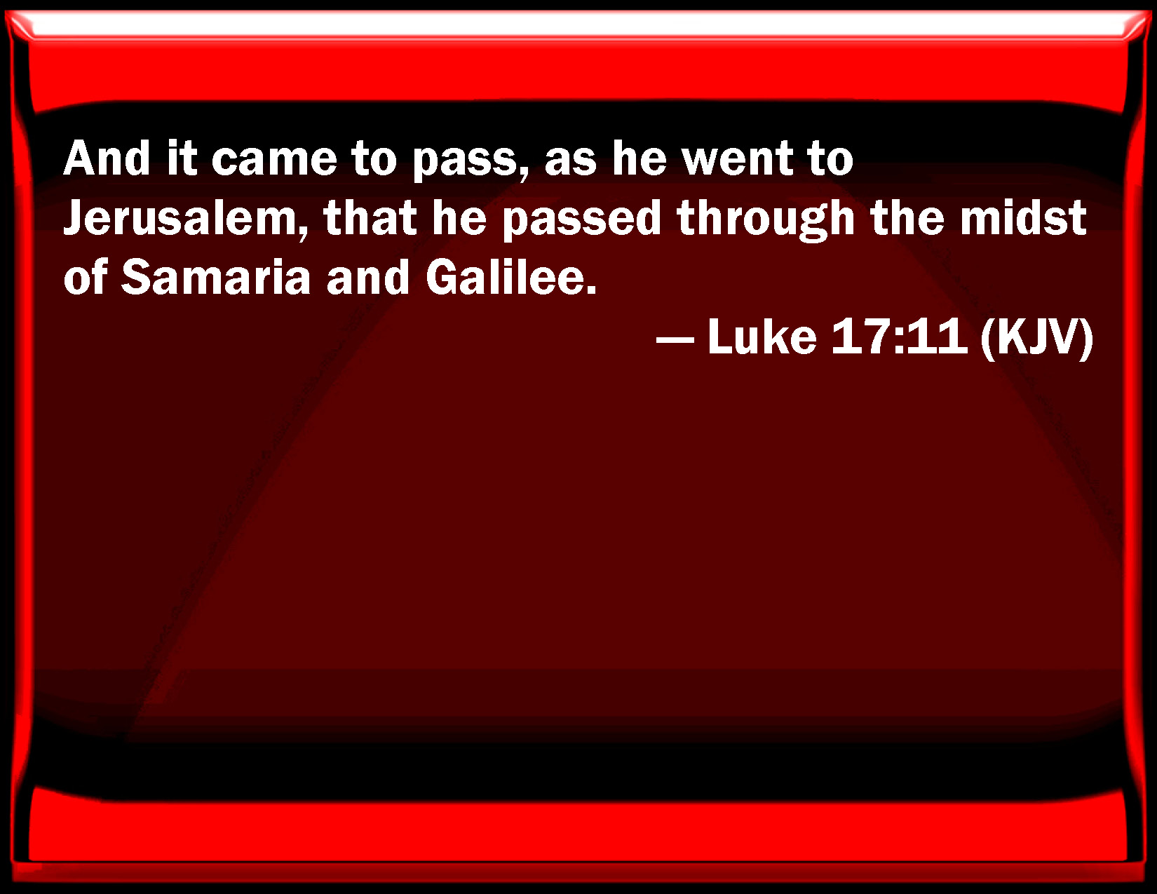Bible Verse Slide Luke 17:11 And it came to pass, as he went to Jerusalem, that he passed through the middle of Samaria and Galilee. KJV: And it came to pass, as he went to Jerusalem, that he passed through the midst of Samaria and Galilee. DRB: And it came to pass, as he was going to Jerusalem, he passed through the midst of Samaria and Galilee. DBT: And it came to pass as he was going up to Jerusalem, that he passed through the midst of Samaria and Galilee. ERV: And it came to pass, as they were on the way to Jerusalem, that he was passing through the midst of Samaria and Galilee. WBT: And it came to pass, as he went to Jerusalem, that he passed through the midst of Samaria and Galilee. WEB: It happened as he was on his way to Jerusalem, that he was passing along the borders of Samaria and Galilee. YLT: And it came to pass, in his going on to Jerusalem, that he passed through the midst of Samaria and Galilee,Links Luke 17:11 NIV • Luke 17:11 NLT • Luke 17:11 ESV • Luke 17:11 NASB • Luke 17:11 KJV • Luke 17:11 Interlinear • Luke 17:11 Commentaries • Luke 17:11 Parallel Texts • Luke 17:11 Bible Apps • Luke 17:11 Parallel • Bible Hub |