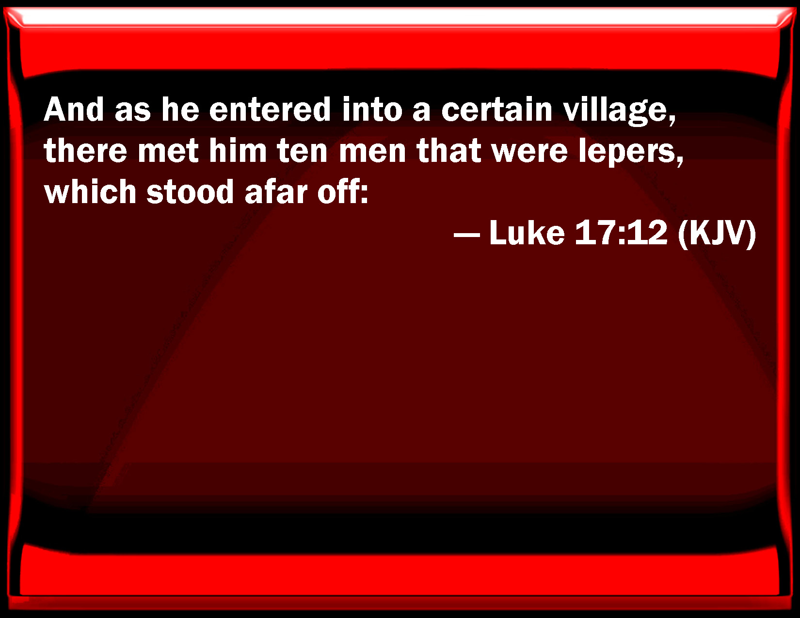 Bible Verse Slide Luke 17:12 And as he entered into a certain village, there met him ten men that were lepers, which stood afar off: KJV: And as he entered into a certain village, there met him ten men that were lepers, which stood afar off: DRB: And as he entered into a certain town, there met him ten men that were lepers, who stood afar off; DBT: And as he entered into a certain village ten leprous men met him, who stood afar off. ERV: And as he entered into a certain village, there met him ten men that were lepers, which stood afar off: WBT: And as he entered into a certain village, there met him ten men that were lepers, who stood at a distance. WEB: As he entered into a certain village, ten men who were lepers met him, who stood at a distance. YLT: and he entering into a certain village, there met him ten leprous men, who stood afar off,Links Luke 17:12 NIV • Luke 17:12 NLT • Luke 17:12 ESV • Luke 17:12 NASB • Luke 17:12 KJV • Luke 17:12 Interlinear • Luke 17:12 Commentaries • Luke 17:12 Parallel Texts • Luke 17:12 Bible Apps • Luke 17:12 Parallel • Bible Hub |