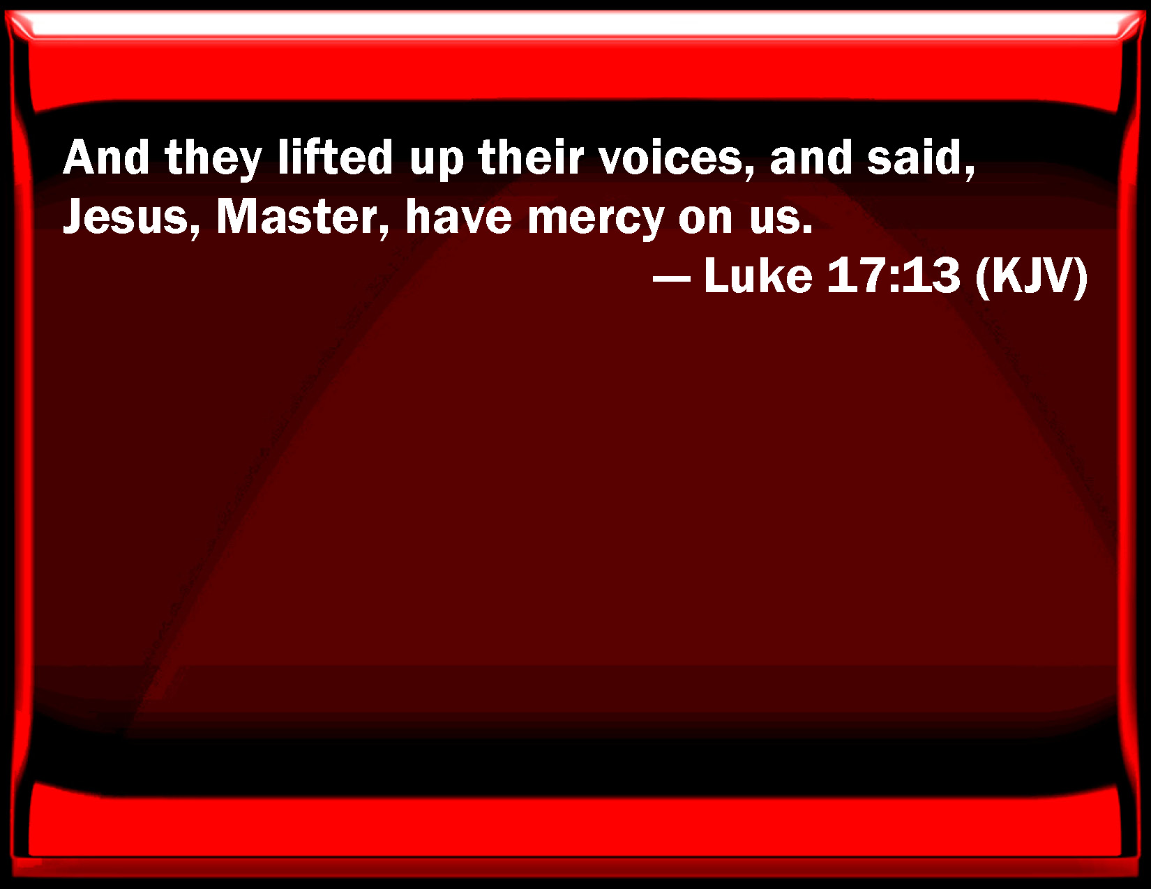 Bible Verse Slide Luke 17:13 And they lifted up their voices, and said, Jesus, Master, have mercy on us. KJV: And they lifted up their voices, and said, Jesus, Master, have mercy on us. DRB: And lifted up their voice, saying: Jesus, master, have mercy on us. DBT: And they lifted up their voice saying, Jesus, Master, have compassion on us. ERV: and they lifted up their voices, saying, Jesus, Master, have mercy on us. WBT: And they lifted up their voices, and said, Jesus, Master, have mercy on us. WEB: They lifted up their voices, saying, "Jesus, Master, have mercy on us!" YLT: and they lifted up the voice, saying, 'Jesus, master, deal kindly with us;'Links Luke 17:13 NIV • Luke 17:13 NLT • Luke 17:13 ESV • Luke 17:13 NASB • Luke 17:13 KJV • Luke 17:13 Interlinear • Luke 17:13 Commentaries • Luke 17:13 Parallel Texts • Luke 17:13 Bible Apps • Luke 17:13 Parallel • Bible Hub |