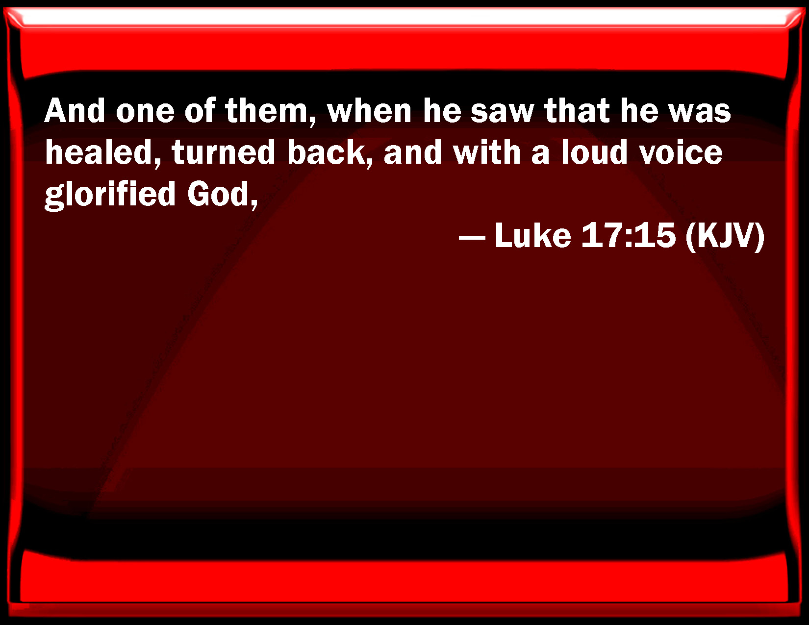 Bible Verse Slide Luke 17:15 And one of them, when he saw that he was healed, turned back, and with a loud voice glorified God, KJV: And one of them, when he saw that he was healed, turned back, and with a loud voice glorified God, DRB: And one of them, when he saw that he was made clean, went back, with a loud voice glorifying God. DBT: And one of them, seeing that he was cured, turned back, glorifying God with a loud voice, ERV: And one of them, when he saw that he was healed, turned back, with a loud voice glorifying God; WBT: And one of them, when he saw that he was healed, turned back, and with a loud voice glorified God, WEB: One of them, when he saw that he was healed, turned back, glorifying God with a loud voice. YLT: and one of them having seen that he was healed did turn back, with a loud voice glorifying God,Links Luke 17:15 NIV • Luke 17:15 NLT • Luke 17:15 ESV • Luke 17:15 NASB • Luke 17:15 KJV • Luke 17:15 Interlinear • Luke 17:15 Commentaries • Luke 17:15 Parallel Texts • Luke 17:15 Bible Apps • Luke 17:15 Parallel • Bible Hub |