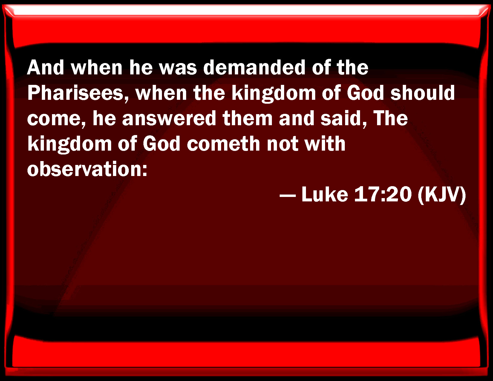 Bible Verse Slide Luke 17:20 And when he was demanded of the Pharisees, when the kingdom of God should come, he answered them and said, The kingdom of God comes not with observation: KJV: And when he was demanded of the Pharisees, when the kingdom of God should come, he answered them and said, The kingdom of God cometh not with observation: DRB: And being asked by the Pharisees, when the kingdom of God should come? he answered them, and said: The kingdom of God cometh not with observation: DBT: And having been asked by the Pharisees, When is the kingdom of God coming? he answered them and said, The kingdom of God does not come with observation; ERV: And being asked by the Pharisees, when the kingdom of God cometh, he answered them and said, The kingdom of God cometh not with observation: WBT: And when he was asked by the Pharisees, when the kingdom of God should come, he answered them and said, The kingdom of God cometh not with observation. WEB: Being asked by the Pharisees when the Kingdom of God would come, he answered them, "The Kingdom of God doesn't come with observation; YLT: And having been questioned by the Pharisees, when the reign of God doth come, he answered them, and said, 'The reign of God doth not come with observation;Links Luke 17:20 NIV • Luke 17:20 NLT • Luke 17:20 ESV • Luke 17:20 NASB • Luke 17:20 KJV • Luke 17:20 Interlinear • Luke 17:20 Commentaries • Luke 17:20 Parallel Texts • Luke 17:20 Bible Apps • Luke 17:20 Parallel • Bible Hub |