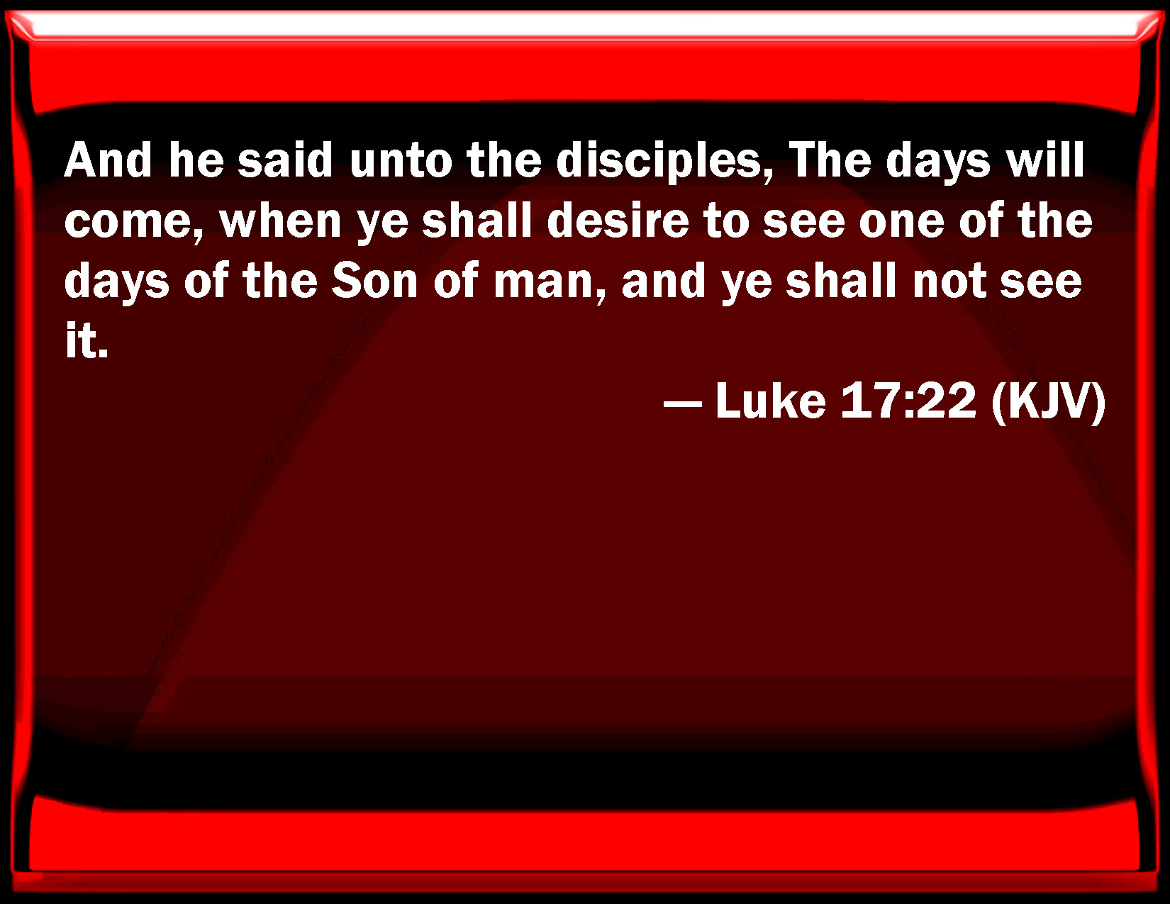 Bible Verse Slide Luke 17:22 And he said to the disciples, The days will come, when you shall desire to see one of the days of the Son of man, and you shall not see it. KJV: And he said unto the disciples, The days will come, when ye shall desire to see one of the days of the Son of man, and ye shall not see it. DRB: And he said to his disciples: The days will come, when you shall desire to see one day of the Son of man; and you shall not see it. DBT: And he said to the disciples, Days are coming, when ye shall desire to see one of the days of the Son of man, and shall not see it. ERV: And he said unto the disciples, The days will come, when ye shall desire to see one of the days of the Son of man, and ye shall not see it. WBT: And he said to his disciples, The days will come, when ye will desire to see one of the days of the son of man, and ye shall not see it. WEB: He said to the disciples, "The days will come, when you will desire to see one of the days of the Son of Man, and you will not see it. YLT: And he said unto his disciples, 'Days will come, when ye shall desire to see one of the days of the Son of Man, and ye shall not behold it;Links Luke 17:22 NIV • Luke 17:22 NLT • Luke 17:22 ESV • Luke 17:22 NASB • Luke 17:22 KJV • Luke 17:22 Interlinear • Luke 17:22 Commentaries • Luke 17:22 Parallel Texts • Luke 17:22 Bible Apps • Luke 17:22 Parallel • Bible Hub |